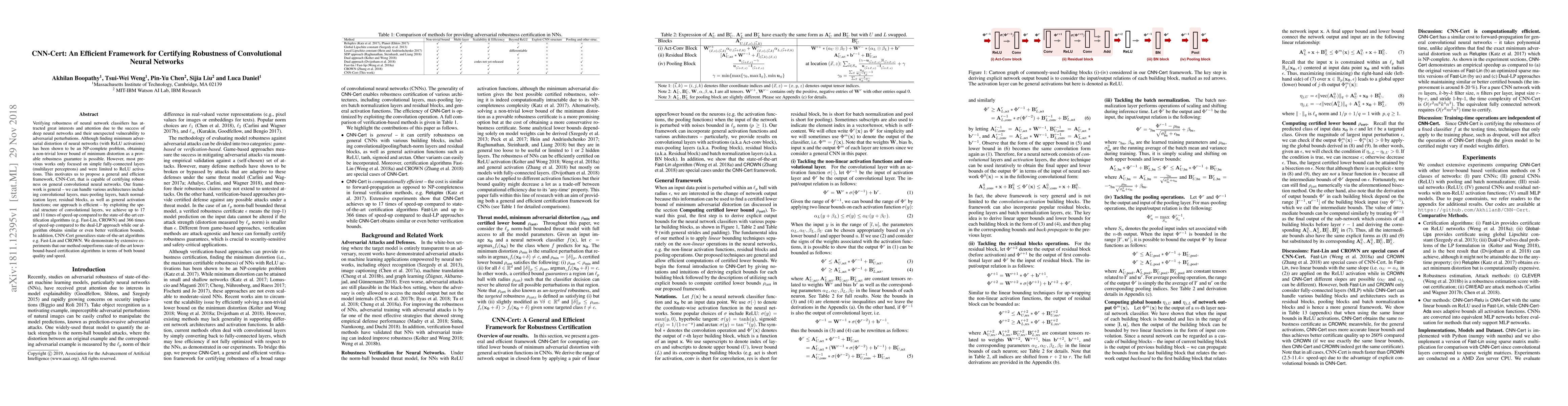 The paper introduces CNN-Cert, an efficient framework for certifying robustness in convolutional neural networks by providing non-trivial lower bounds on adversarial distortion. CNN-Cert generalizes to various network architectures and activation functions, achieving significant speed-ups compared to existing methods while maintaining or improving verification bounds.