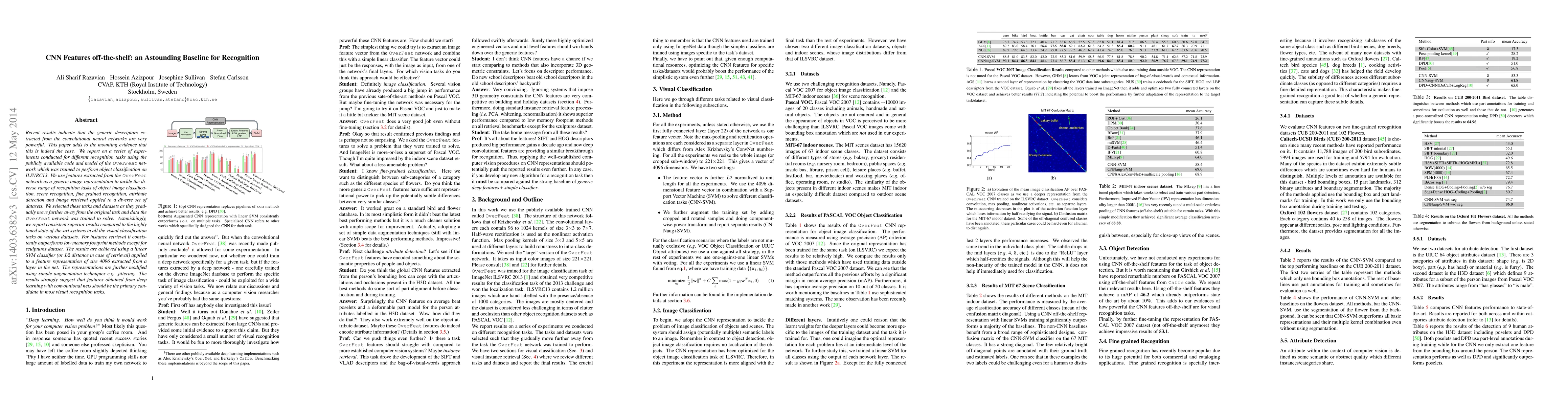 Recent results indicate that the generic descriptors extracted from the convolutional neural networks are very powerful. This paper adds to the mounting evidence that this is indeed the case. We report on a series of experiments conducted for different recognition tasks using the publicly available code and model of the \overfeat network which was trained to perform object classification on ILSVRC13. We use features extracted from the \overfeat network as a generic image representation to tackle the diverse range of recognition tasks of object image classification, scene recognition, fine grained recognition, attribute detection and image retrieval applied to a diverse set of datasets. We selected these tasks and datasets as they gradually move further away from the original task and data the \overfeat network was trained to solve. Astonishingly, we report consistent superior results compared to the highly tuned state-of-the-art systems in all the visual classification tasks on various datasets. For instance retrieval it consistently outperforms low memory footprint methods except for sculptures dataset. The results are achieved using a linear SVM classifier (or $L2$ distance in case of retrieval) applied to a feature representation of size 4096 extracted from a layer in the net. The representations are further modified using simple augmentation techniques e.g. jittering. The results strongly suggest that features obtained from deep learning with convolutional nets should be the primary candidate in most visual recognition tasks.