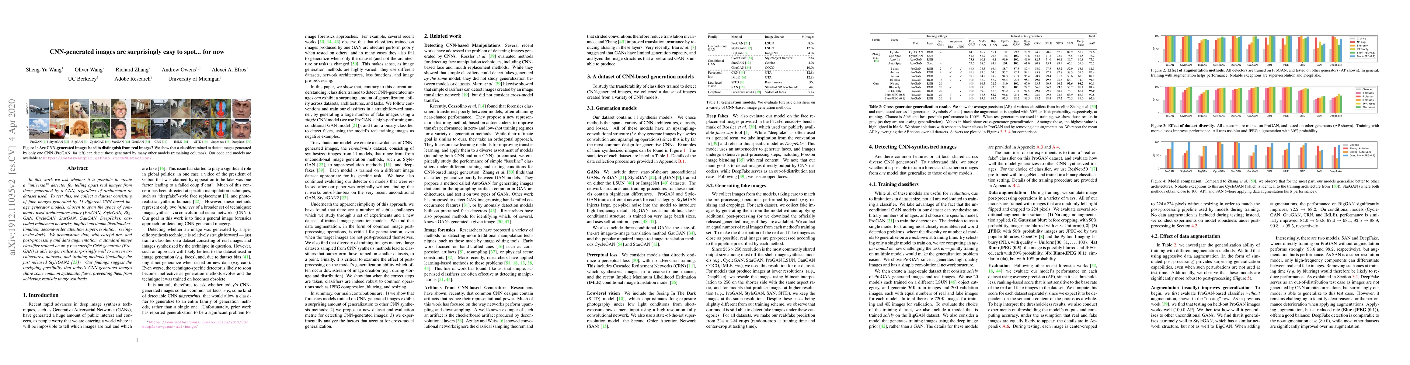 In this work we ask whether it is possible to create a "universal" detector for telling apart real images from these generated by a CNN, regardless of architecture or dataset used. To test this, we collect a dataset consisting of fake images generated by 11 different CNN-based image generator models, chosen to span the space of commonly used architectures today (ProGAN, StyleGAN, BigGAN, CycleGAN, StarGAN, GauGAN, DeepFakes, cascaded refinement networks, implicit maximum likelihood estimation, second-order attention super-resolution, seeing-in-the-dark). We demonstrate that, with careful pre- and post-processing and data augmentation, a standard image classifier trained on only one specific CNN generator (ProGAN) is able to generalize surprisingly well to unseen architectures, datasets, and training methods (including the just released StyleGAN2). Our findings suggest the intriguing possibility that today's CNN-generated images share some common systematic flaws, preventing them from achieving realistic image synthesis. Code and pre-trained networks are available at https://peterwang512.github.io/CNNDetection/ .
