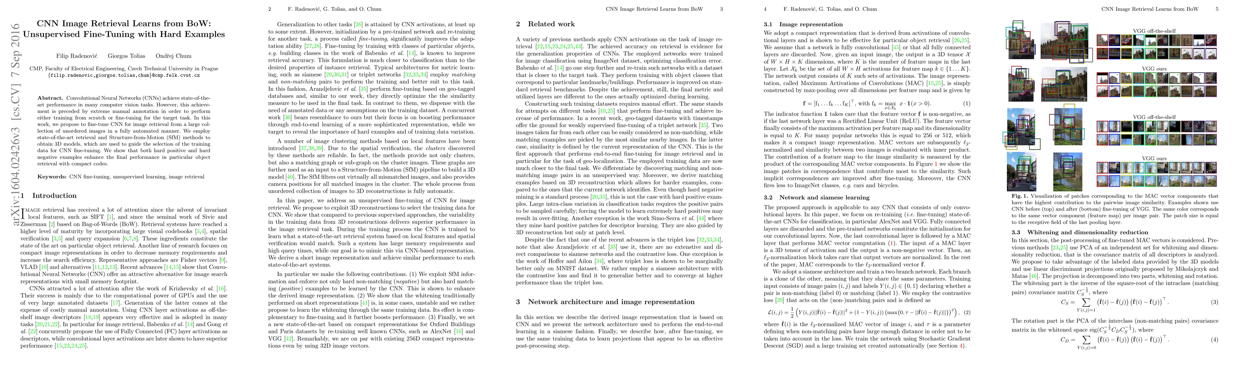 A new method for fine-tuning CNNs to perform image retrieval without manual annotation is proposed, using 3D models and hard examples to enhance performance.