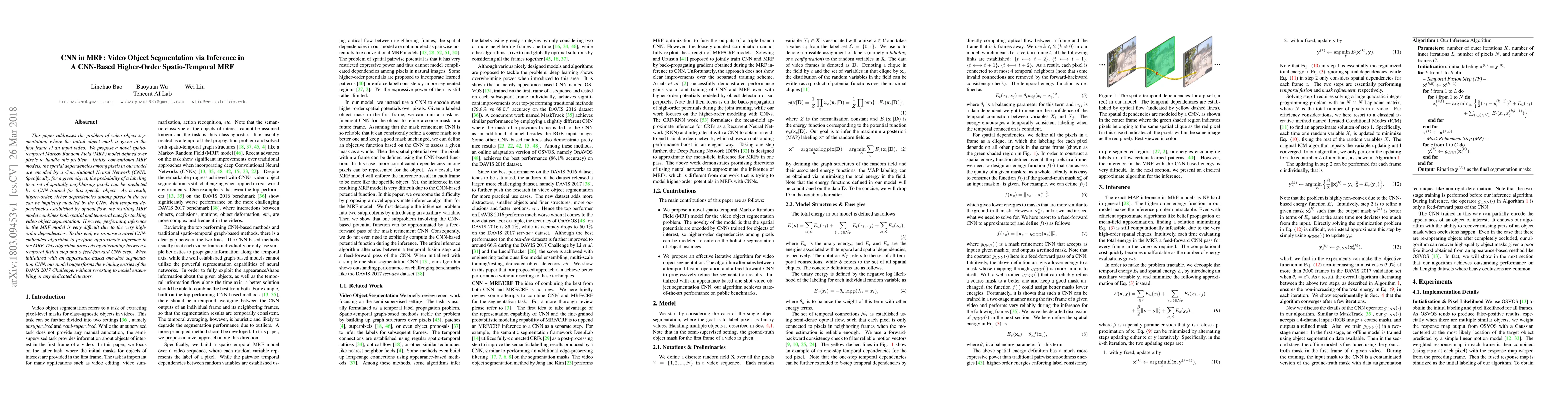 This research paper proposes a novel spatio-temporal Markov Random Field (MRF) model for video object segmentation, leveraging a Convolutional Neural Network (CNN) to encode spatial dependencies among pixels. The model incorporates temporal dependencies via optical flow, combining spatial and temporal cues for improved segmentation. To address the challenge of high-order dependencies in inference, a CNN-embedded algorithm is introduced for approximate inference, achieving superior results compared to other methods in the DAVIS 2017 Challenge.