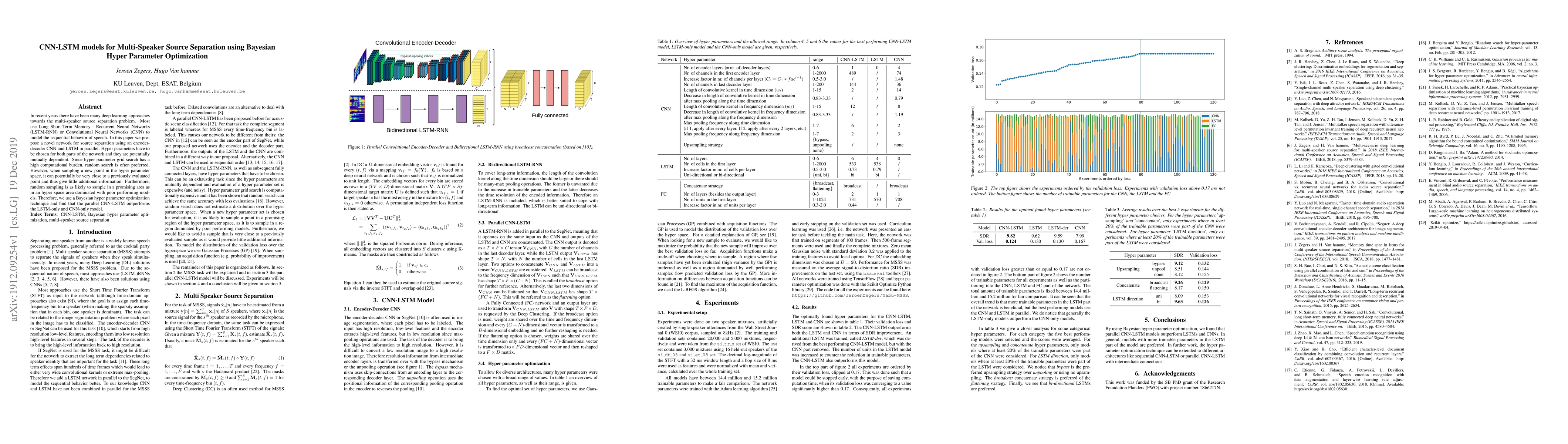 This research paper proposes a novel CNN-LSTM model for multi-speaker source separation, utilizing Bayesian hyper parameter optimization to improve performance. The parallel CNN-LSTM architecture outperforms both standalone LSTM-RNN and CNN models, demonstrating enhanced capability in separating multiple speech sources. For more details, please refer to the original publication.