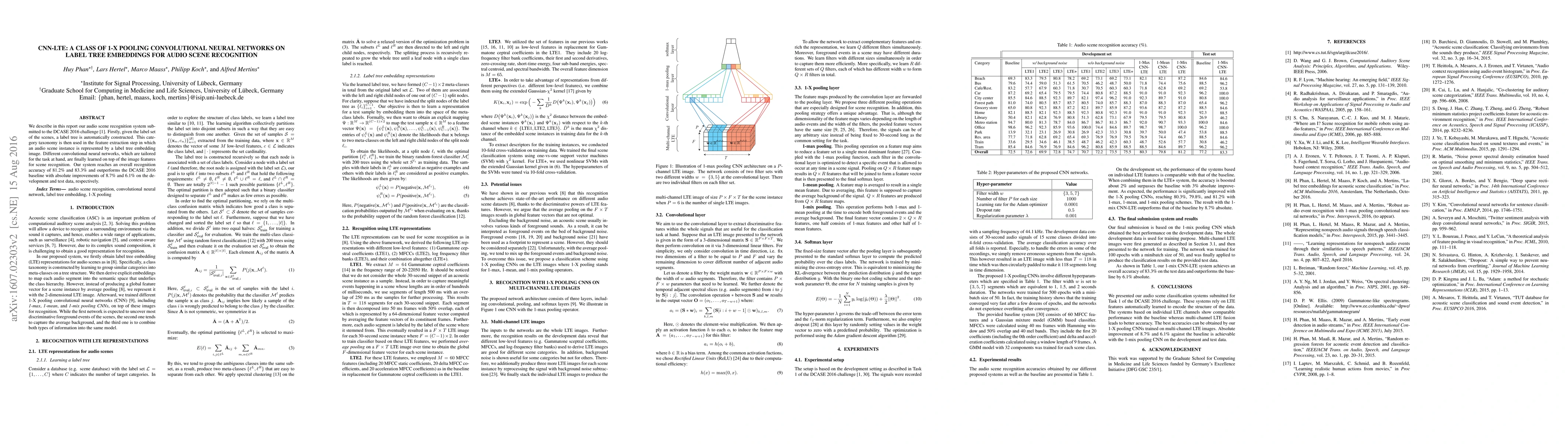 This research introduces a novel audio scene recognition system that leverages label tree embeddings and tailored convolutional neural networks (CNNs) for improved accuracy. The system constructs a label tree from scene categories and uses it to represent audio scenes as image features, achieving recognition accuracies of 81.2% and 83.3%, outperforming the DCASE 2016 baseline by significant margins. For more details, please refer to the original paper.