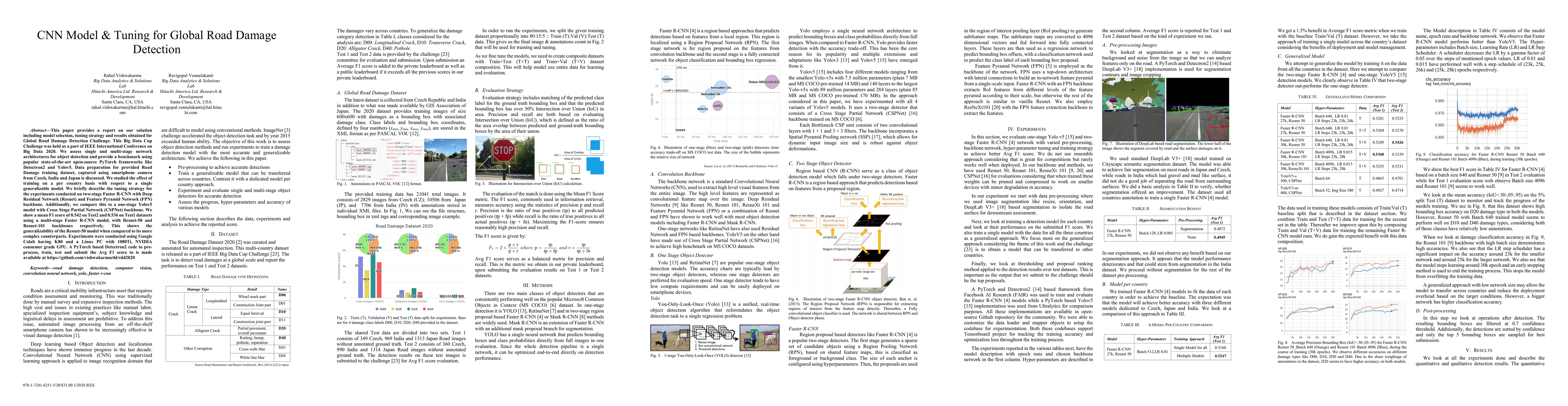 This paper explores CNN models, specifically multi-stage Faster R-CNN and one-stage Yolov5, for detecting global road damage using datasets from Czech, India, and Japan. The study demonstrates the generalizability of a Resnet-50 model, achieving a mean F1 score of 0.542 and 0.536 on Test2 and Test1 datasets respectively.