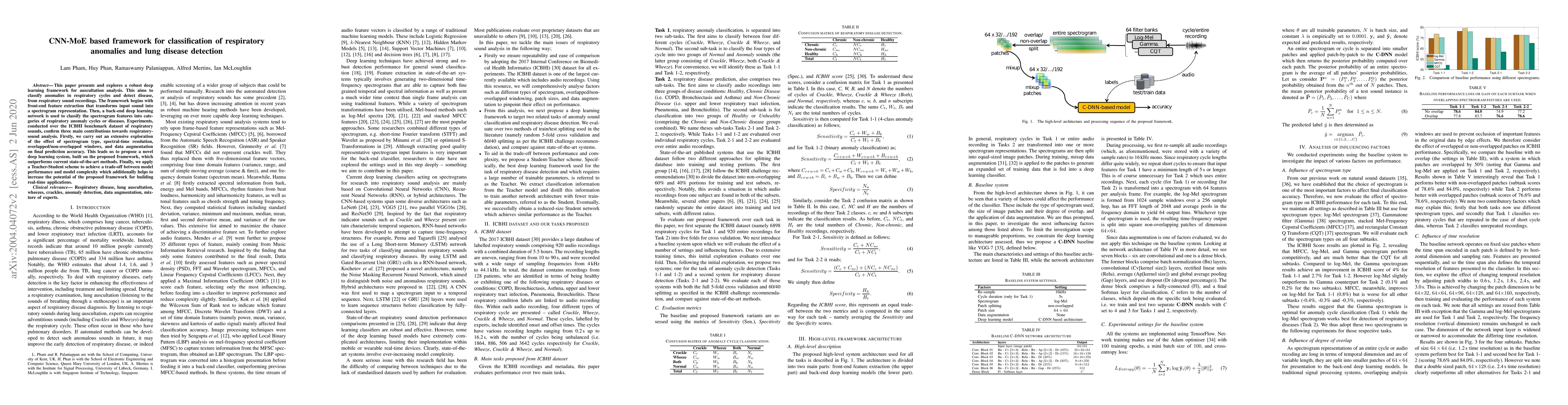 This paper introduces a CNN-MoE framework for classifying respiratory anomalies and detecting lung diseases from sound recordings, achieving superior performance over existing methods. The framework optimizes feature extraction and employs a Teacher-Student scheme to balance performance and complexity for real-time applications.