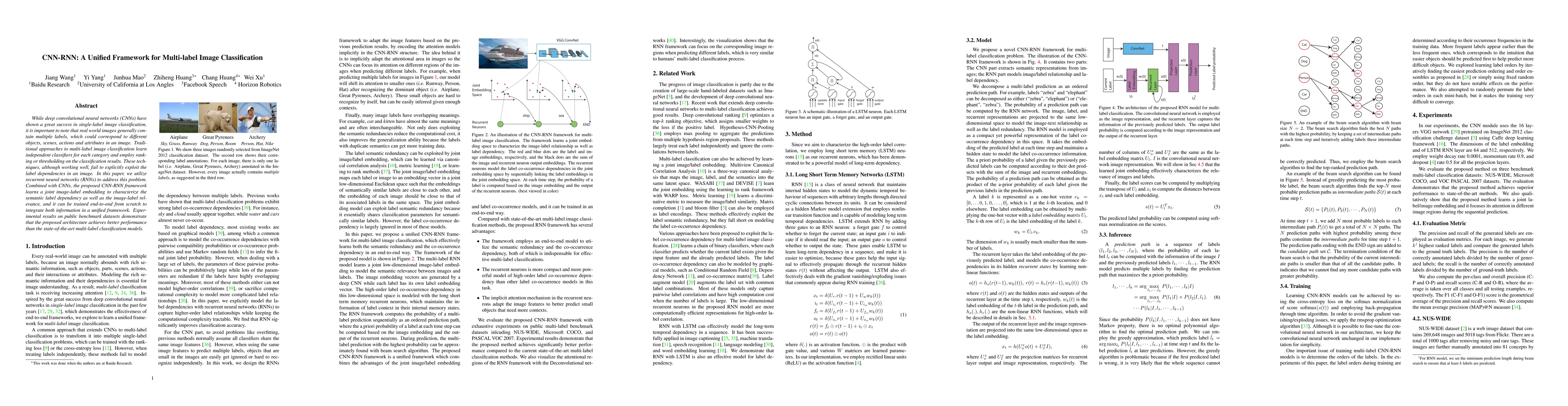 This paper proposes a CNN-RNN framework for multi-label image classification that leverages both convolutional and recurrent neural networks to capture label dependencies and image-label relevance. The unified model outperforms existing methods by integrating both features in an end-to-end trainable architecture.
