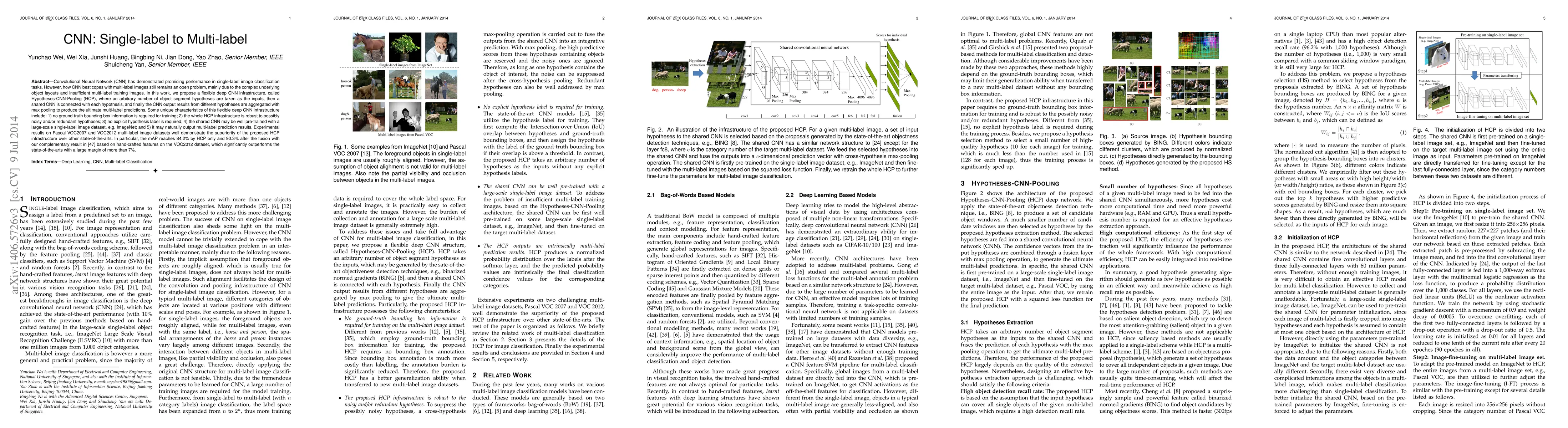 This research proposes a novel deep CNN infrastructure named Hypotheses-CNN-Pooling (HCP) to address the challenge of multi-label image classification. The HCP framework allows for flexible input of multiple object segment hypotheses, aggregates their outputs via max pooling, and demonstrates robust performance without requiring ground truth bounding boxes or explicit hypothesis labels. Experimental results show significant improvements over existing methods on multi-label image datasets.
