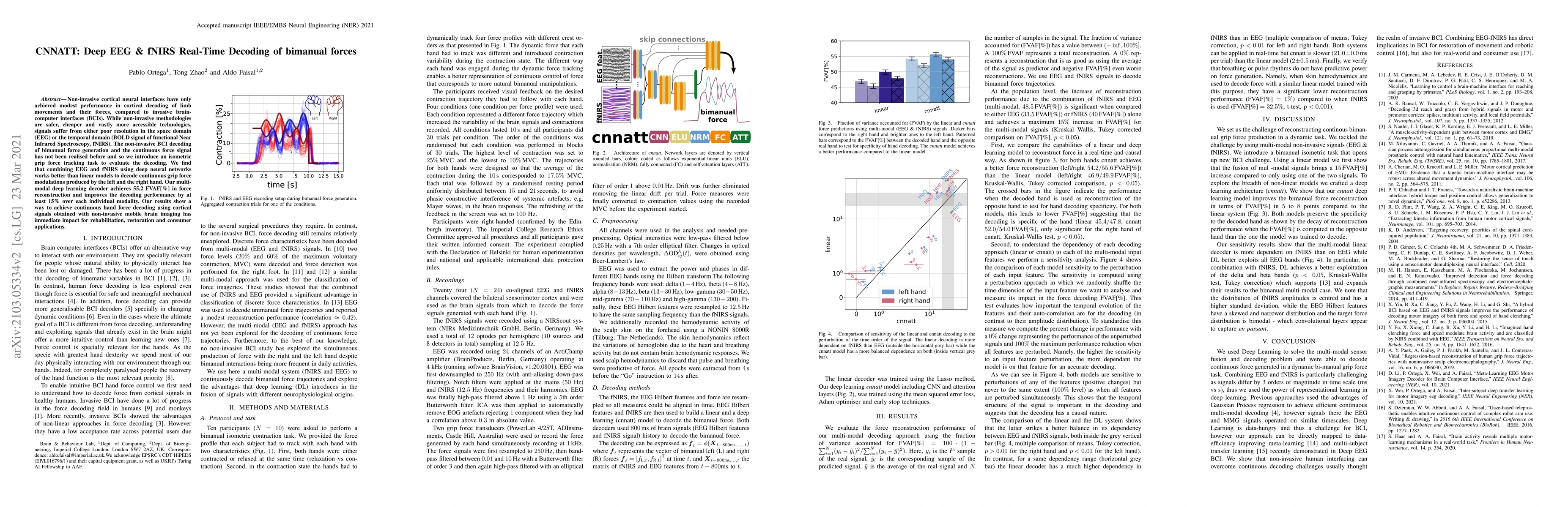 This paper introduces a deep neural network combining EEG and fNIRS to decode bimanual forces in real-time, achieving a 55.2% FVAF in force reconstruction. The multi-modal approach outperforms linear models and improves decoding performance by at least 15% over individual modalities, offering potential for rehabilitation and consumer applications.