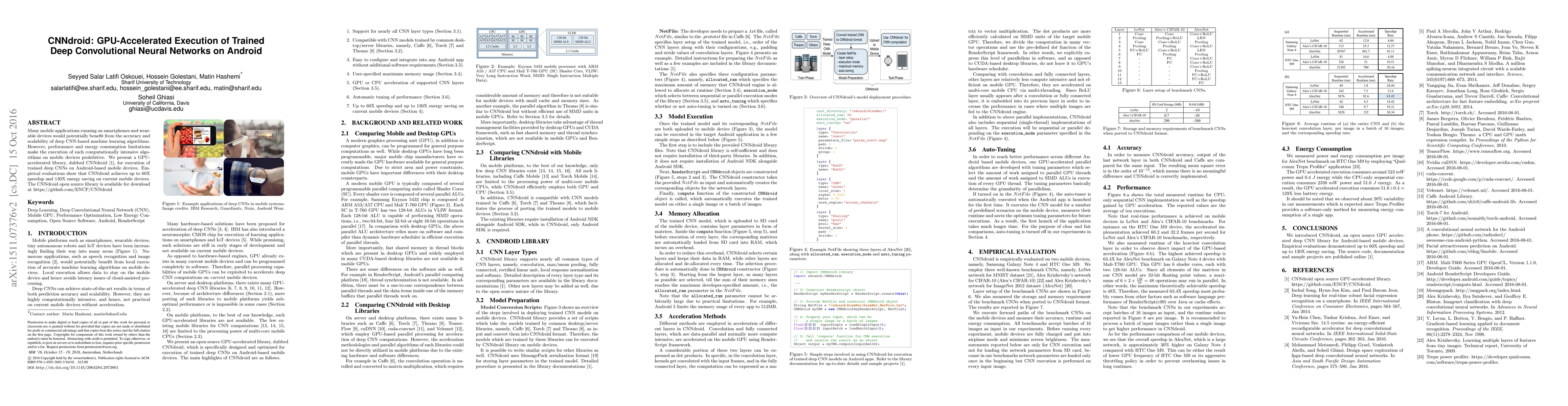 CNNdroid is a GPU-accelerated library enabling the execution of trained deep convolutional neural networks on Android devices, achieving up to 60X speedup and 130X energy savings compared to CPU-only execution. The open-source library is available for download to enhance the performance of mobile machine learning applications.