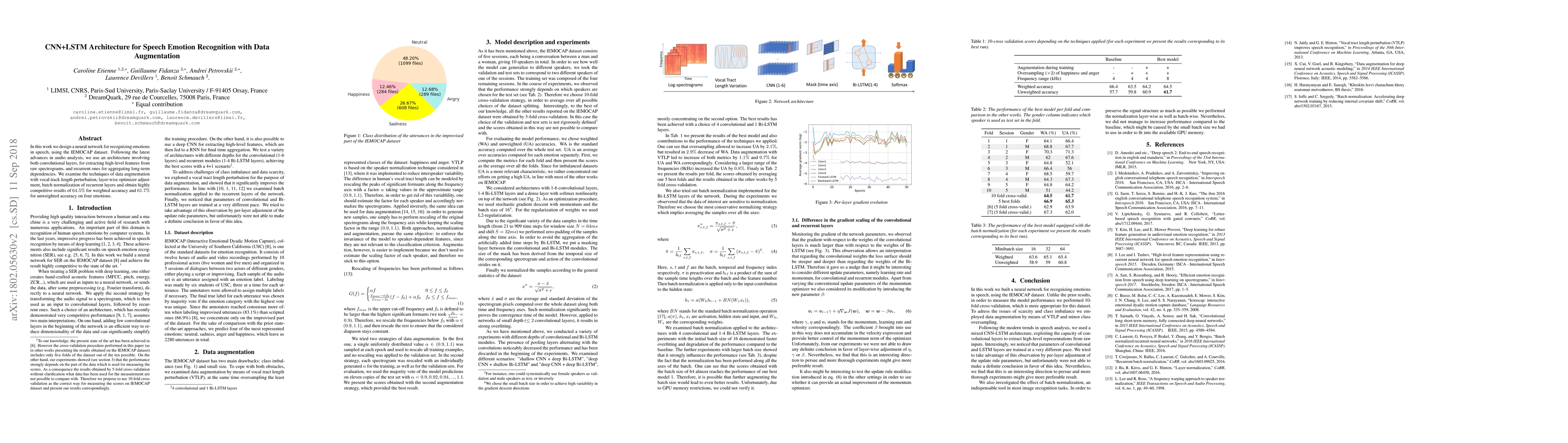 In this work we design a neural network for recognizing emotions in speech, using the IEMOCAP dataset. Following the latest advances in audio analysis, we use an architecture involving both convolutional layers, for extracting high-level features from raw spectrograms, and recurrent ones for aggregating long-term dependencies. We examine the techniques of data augmentation with vocal track length perturbation, layer-wise optimizer adjustment, batch normalization of recurrent layers and obtain highly competitive results of 64.5% for weighted accuracy and 61.7% for unweighted accuracy on four emotions.