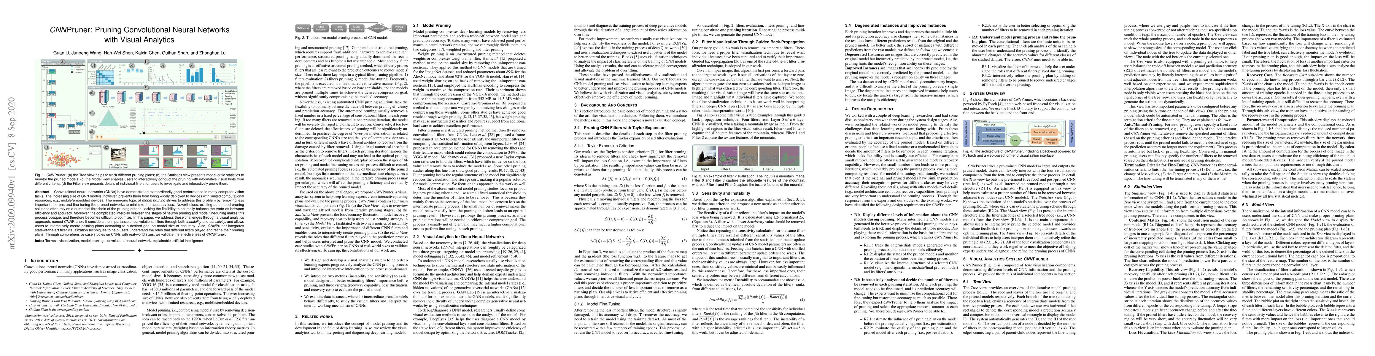 CNNPruner introduces a visual analytics approach to optimize the pruning of convolutional neural networks, balancing model size and accuracy through interactive, user-guided pruning plans. It leverages filter visualization techniques to enhance understanding and refinement of pruning strategies, validated through real-world case studies.