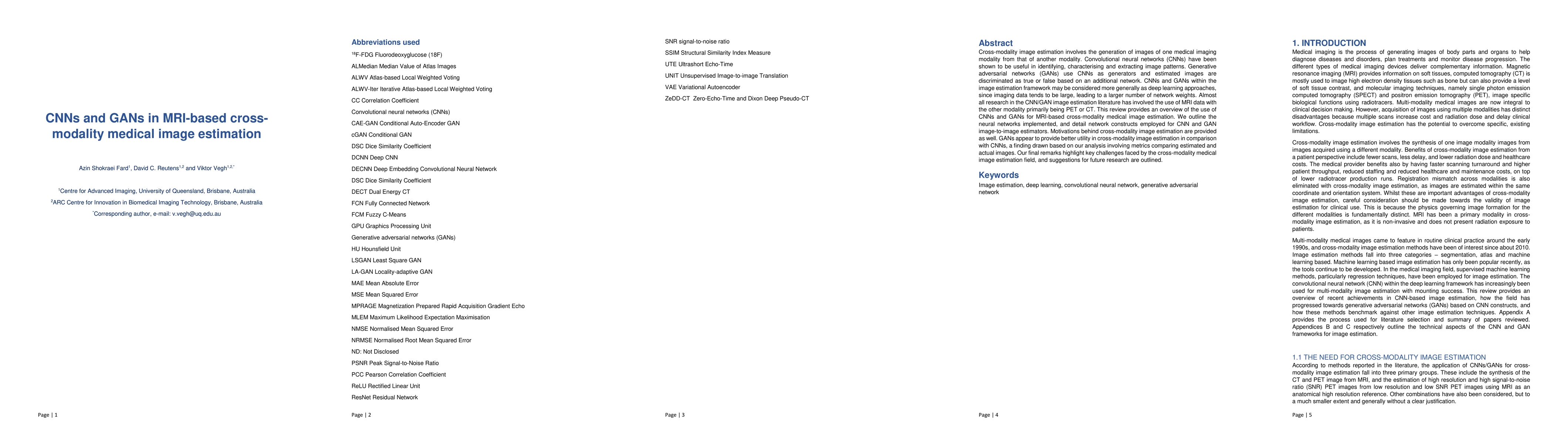 This paper reviews the application of CNNs and GANs for MRI-based cross-modality medical image estimation, highlighting that GANs generally outperform CNNs in generating accurate images. The review outlines network architectures and discusses challenges and future research directions in this field.