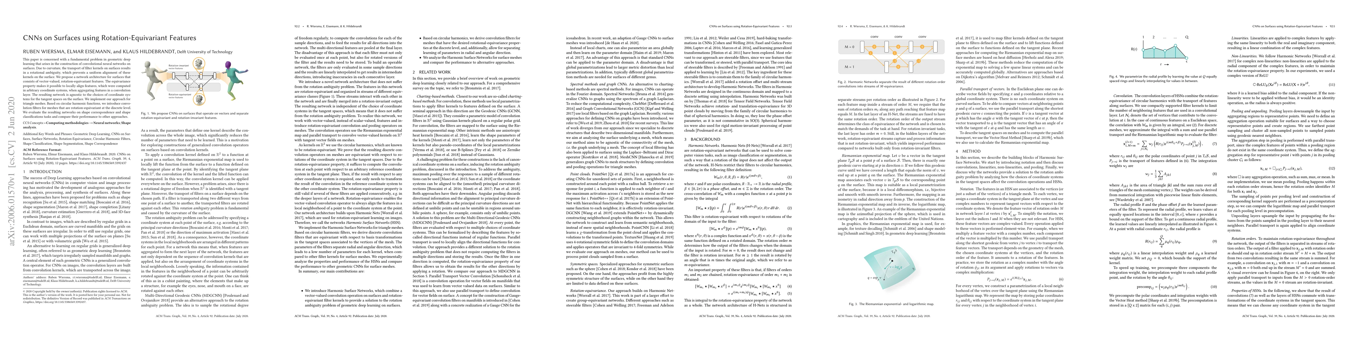 This paper proposes a convolutional neural network architecture for surfaces that uses rotation-equivariant features to address the issue of rotational ambiguity in filter kernel alignment. The network's performance is evaluated on shape correspondence and classification tasks, demonstrating its effectiveness compared to other methods.