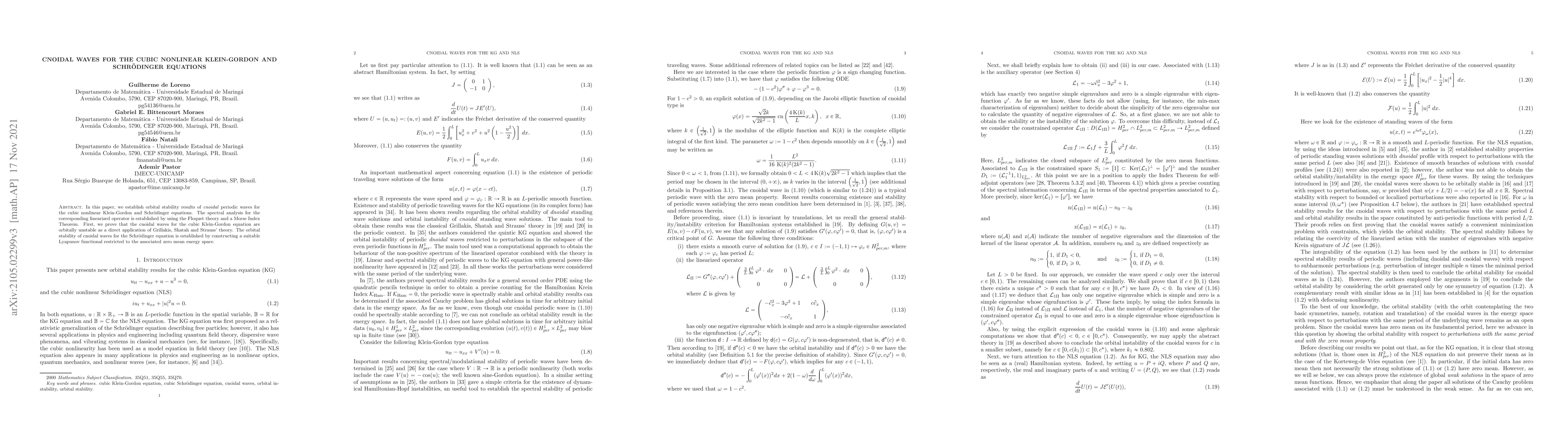 This paper investigates the orbital stability of cnoidal periodic waves for cubic nonlinear Klein-Gordon and Schrödinger equations. It uses Floquet theory and a Morse Index Theorem to analyze the linearized operator, proving orbital instability for Klein-Gordon cnoidal waves and establishing orbital stability for Schrödinger cnoidal waves via a constructed Lyapunov functional.