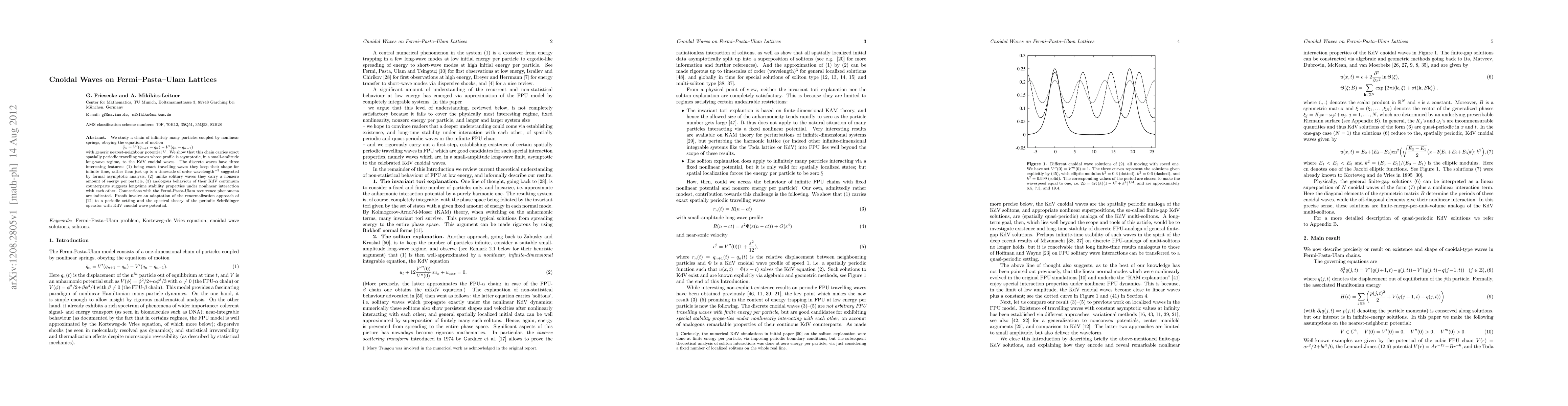 This paper investigates nonlinear waves in a Fermi-Pasta-Ulam lattice, demonstrating that it supports exact travelling cnoidal waves that maintain their shape indefinitely and carry energy per particle. The study connects these findings to the KdV cnoidal waves and the lattice's recurrence phenomena.