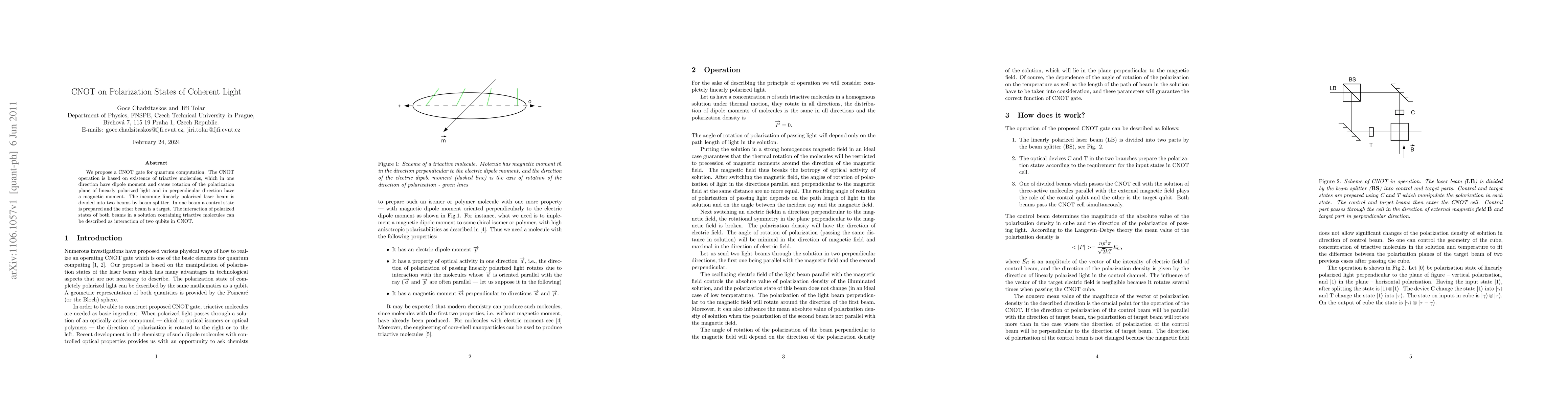 We propose a CNOT gate for quantum computation. The CNOT operation is based on existence of triactive molecules, which in one direction have dipole moment and cause rotation of the polarization plane of linearly polarized light and in perpendicular direction have a magnetic moment. The incoming linearly polarized laser beam is divided into two beams by beam splitter. In one beam a control state is prepared and the other beam is a target. The interaction of polarized states of both beams in a solution containing triactive molecules can be described as interaction of two qubits in CNOT.