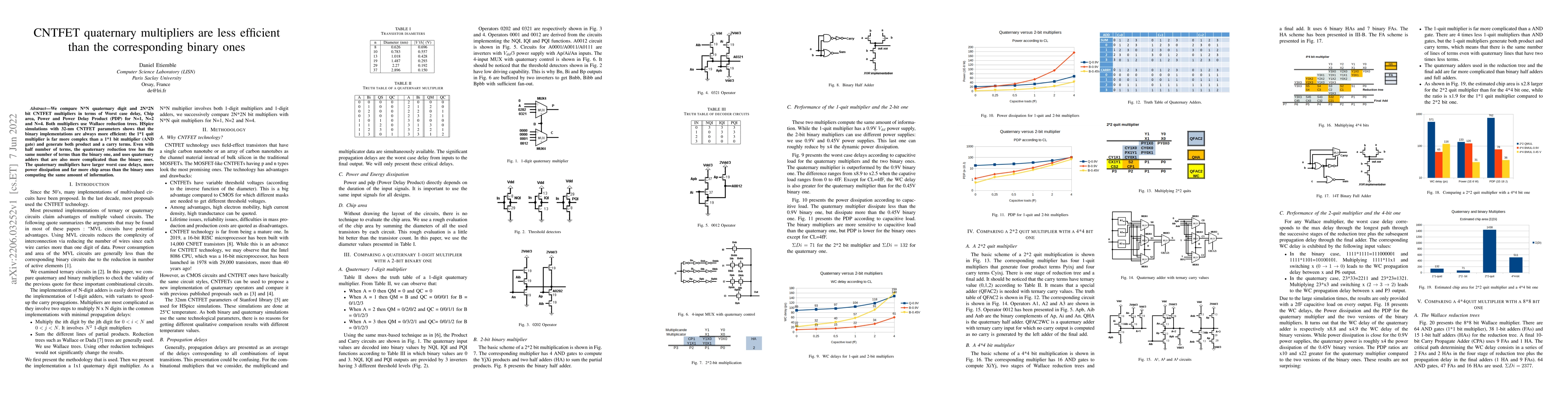 We compare N*N quaternary digit and 2N*2N bit CNTFET multipliers in terms of Worst case delay, Chip area, Power and Power Delay Product (PDP) for N=1, N=2 and N=4. Both multipliers use Wallace reduction trees. HSpice simulations with 32-nm CNTFET parameters shows that the binary implementations are always more efficient: the 1*1 quit multiplier is far more complex than a 1*1 bit multiplier (AND gate) and generate both product and a carry terms. Even with half number of terms, the quaternary reduction tree has the same number of terms than the binary one, and uses quaternary adders that are also more complicated than the binary ones. The quaternary multipliers have larger worst case delays, more power dissipation and far more chip areas than the binary ones computing the same amount of information.