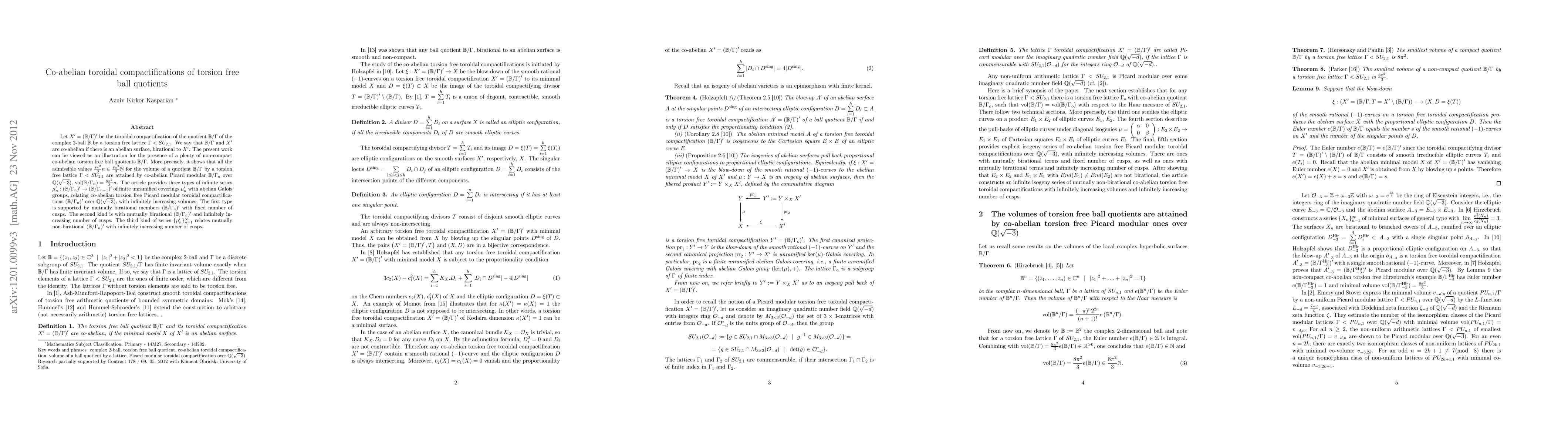 This paper explores co-abelian toroidal compactifications of torsion-free ball quotients, demonstrating that all admissible volume values for such quotients are achieved by co-abelian Picard modular compactifications. It presents three infinite series of finite unramified coverings with increasing volumes and varying cusp structures.