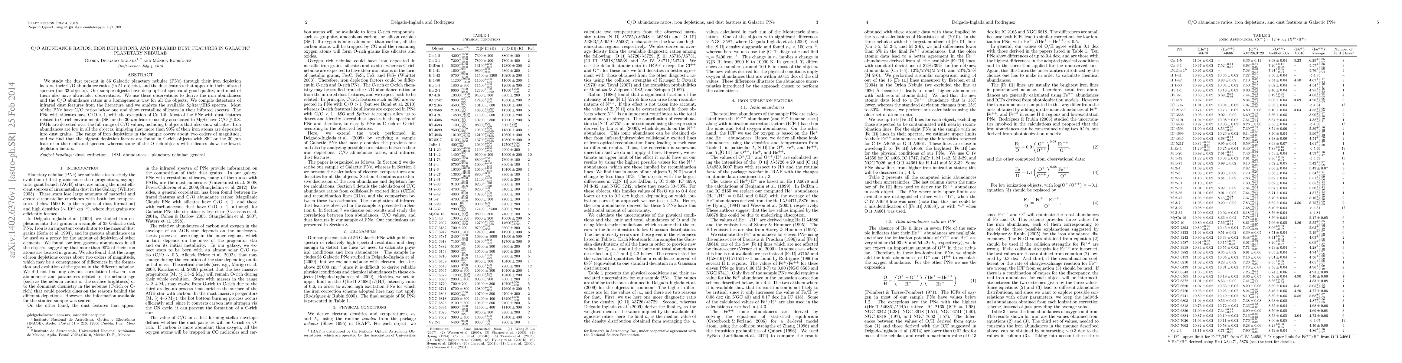 This study investigates the dust in 56 Galactic planetary nebulae (PNe) using iron depletion factors, C/O abundance ratios, and infrared dust features. Most PNe exhibit C/O ratios below one and contain crystalline silicates, with iron depletions exceeding 90%, indicating significant iron deposition into dust grains.
