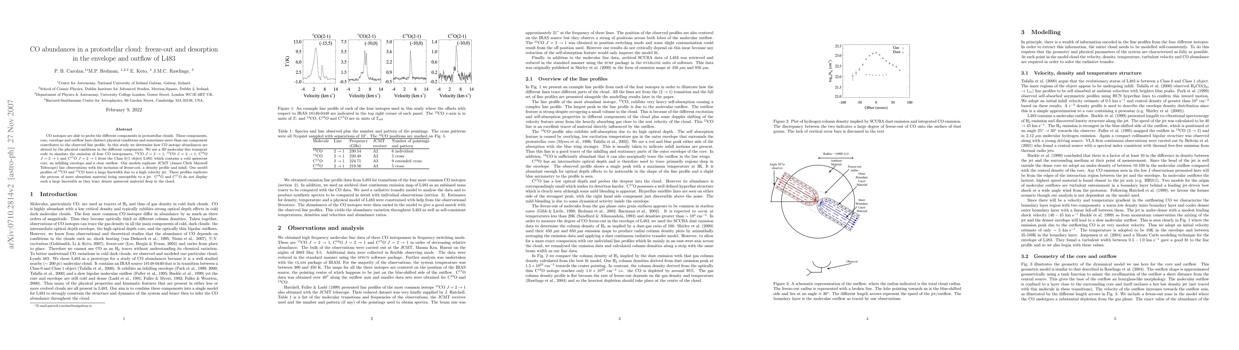 This study investigates the variations in CO isotope abundances in the protostellar cloud L483, focusing on the core, envelope, and outflow regions. Using a 3D molecular line transport code, the research simulates the emission of four CO isotopomers, revealing that 12CO and 13CO profiles are broadened by high-velocity jets, while C18O and C17O trace denser, quiescent material.