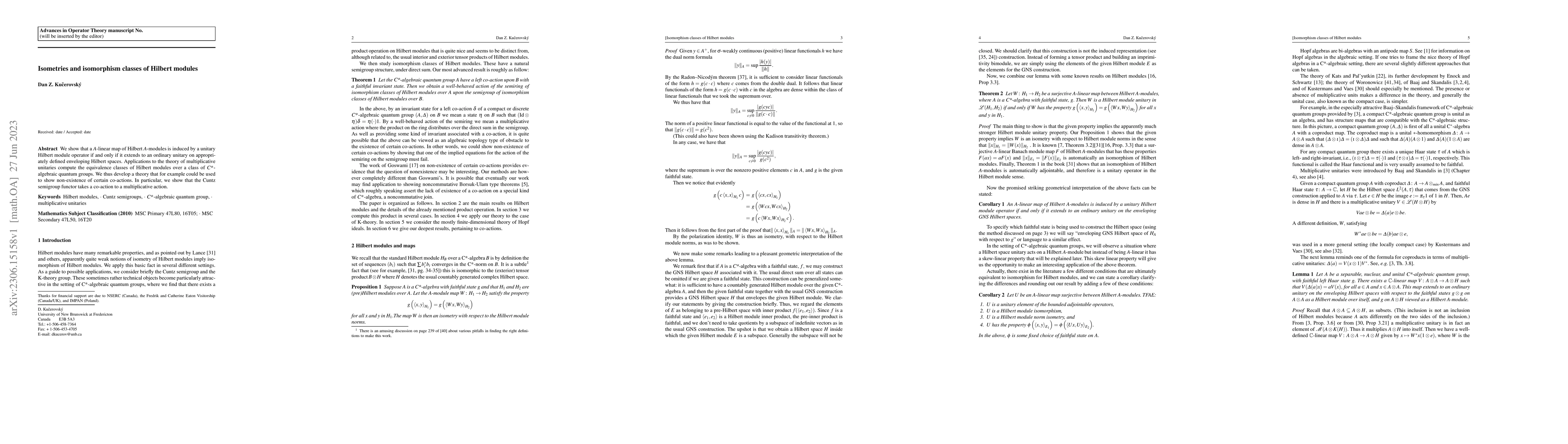 We show that a A-linear map of Hilbert A-modules is induced by a unitary Hilbert module operator if and only if it extends to an ordinary unitary on appropriately defined enveloping Hilbert spaces. Applications to the theory of multiplicative unitaries compute the equivalence classes of Hilbert modules over a class of C*- algebraic quantum groups. We thus develop a theory that for example could be used to show non-existence of certain co-actions. In particular, we show that the Cuntz semigroup functor takes a co-action to a multiplicative action.
