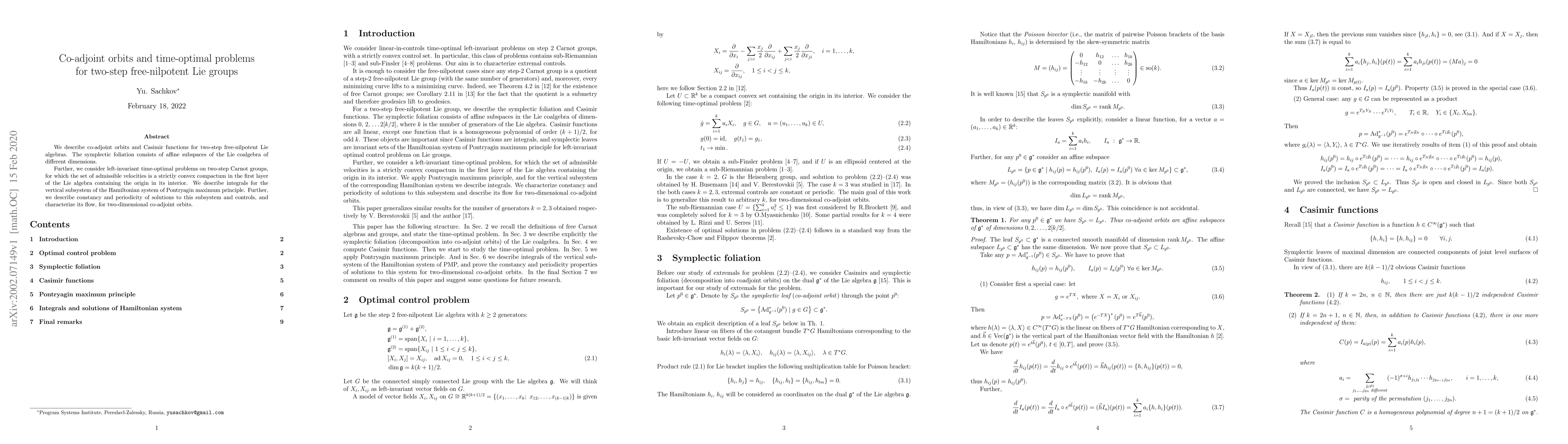 Summary: This paper explores co-adjoint orbits and Casimir functions for two-step free-nilpotent Lie algebras, examining their symplectic structure. It also investigates left-invariant time-optimal control problems on two-step Carnot groups, detailing the integrals and properties of the vertical subsystem in the Hamiltonian system.