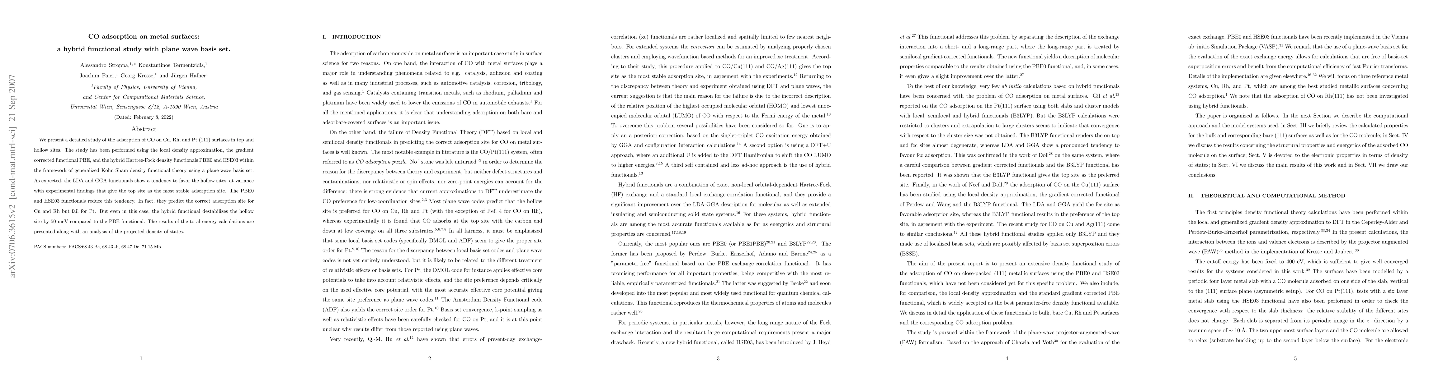 This study investigates CO adsorption on Cu, Rh, and Pt (111) surfaces using hybrid functional density functional theory, revealing that hybrid functionals like PBE0 and HSE03 better predict the top site as the most stable adsorption site compared to LDA and GGA functionals, though they still fail for Pt.