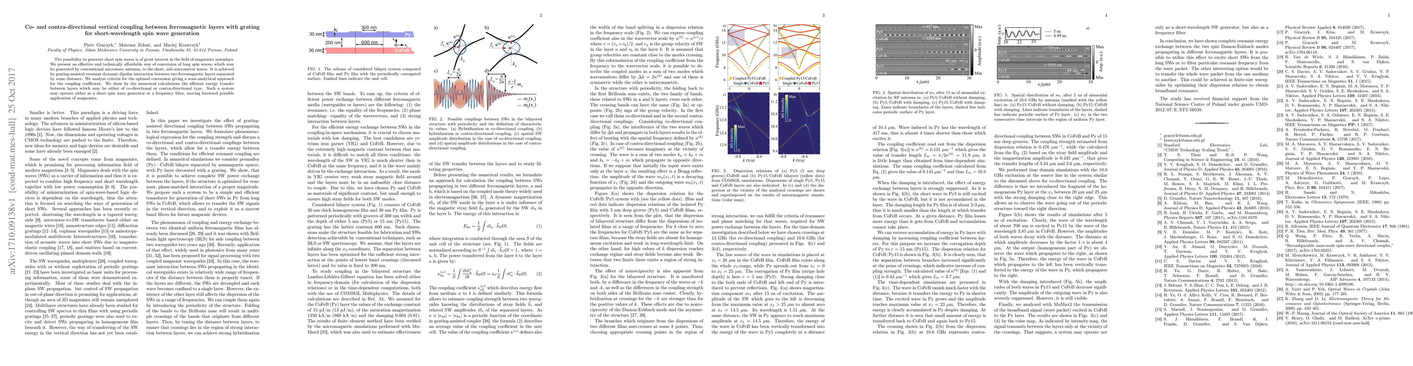 The possibility to generate short spin waves is of great interest in the field of magnonics nowadays. We present an effective and technically affordable way of conversion of long spin waves, which may be generated by conventional microwave antenna, to the short, sub-micrometer waves. It is achieved by grating-assisted resonant dynamic dipolar interaction between two ferromagnetic layers separated by some distance. We analyze criteria for the optimal conversion giving a semi-analytical approach for the coupling coefficient. We show by the numerical calculations the efficient energy transfer between layers which may be either of co-directional or contra-directional type. Such a system may operate either as a short spin wave generator or a frequency filter, moving foreward possible application of magnonics.