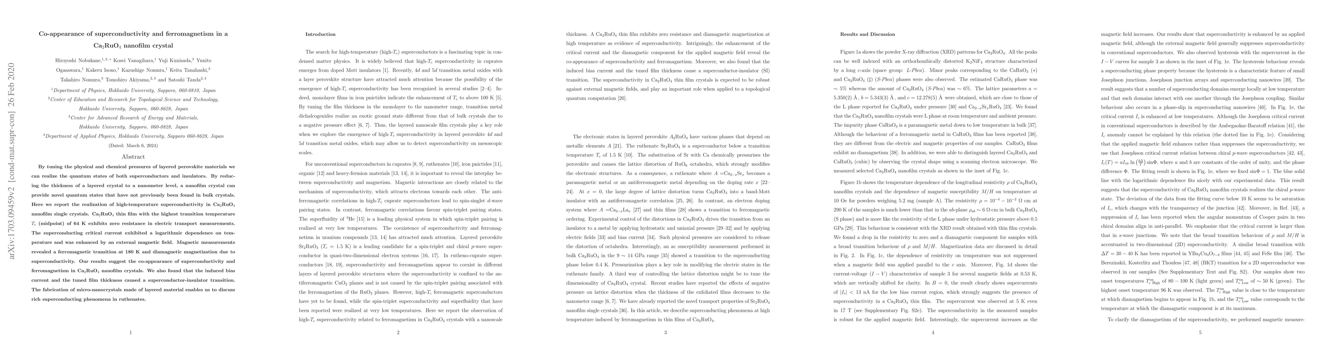 This paper reports the discovery of high-temperature superconductivity and ferromagnetism co-existing in Ca$_2$RuO$_4$ nanofilm crystals, with a transition temperature of 64 K and a ferromagnetic transition at 180 K. The study highlights the novel quantum states enabled by nanofilm fabrication.