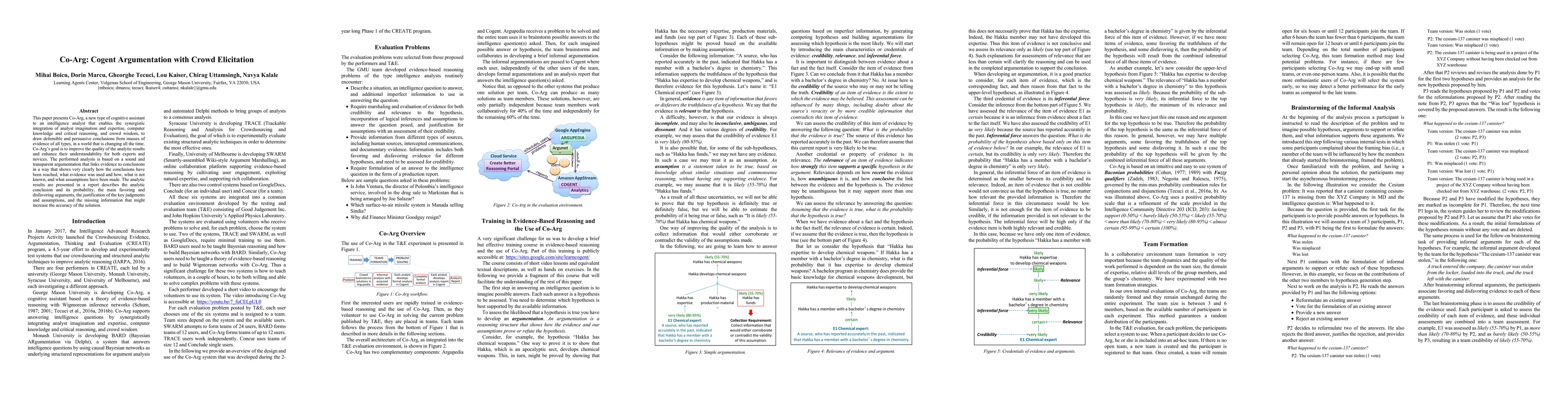 Co-Arg is a cognitive assistant designed to integrate analyst expertise, computer reasoning, and crowd wisdom to produce clear, defendable conclusions from diverse evidence. It aims to enhance both the quality and understandability of analytic results for experts and novices alike.