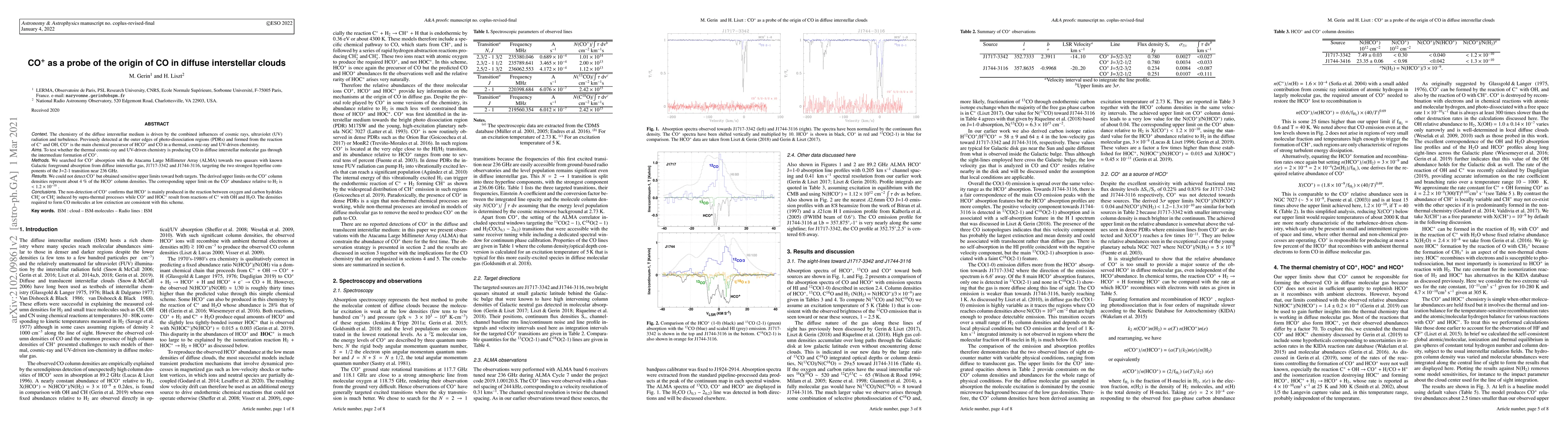 The chemistry of the diffuse interstellar medium is driven by the combined influences of cosmic rays, ultraviolet (UV) radiation, and turbulence. Previously detected at the outer edges of photodissociation regions (PDRs) and formed from the reaction of C+ and OH, CO+ is the main chemical precursor of HCO+ and CO in a thermal, cosmic-ray, and UV-driven chemistry. Our aim was to test whether the thermal cosmic-ray and UV-driven chemistry is producing CO in diffuse interstellar molecular gas through the intermediate formation of CO+ We searched for CO+ absorption with the Atacama Large Millimeter Array (ALMA) toward two quasars with known Galactic foreground absorption from diffuse interstellar gas, J1717-3342 and J1744-3116, targeting the two strongest hyperfine components of the J=2-1 transition near 236 GHz. We could not detect CO+ but obtained sensitive upper limits toward both targets. The derived upper limits on the CO+ column densities represent about 4% of the HCO+ column densities. The corresponding upper limit on the CO+ abundance relative to H2 is <1.2 x 10^{-10}. The non-detection of CO+ confirms that HCO+ is mainly produced in the reaction between oxygen and carbon hydrides, CH2+ or CH3+ , induced by suprathermal processes, while CO+ and HOC+ result from reactions of C+ with OH and H2O. The densities required to form CO molecules at low extinction are consistent with this scheme.
