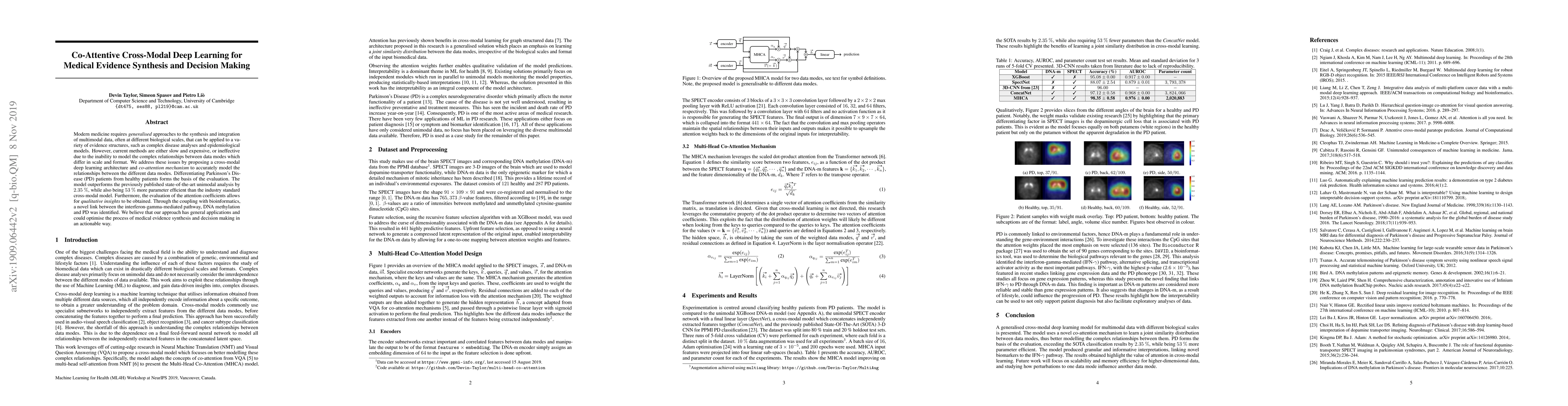 This research proposes a cross-modal deep learning architecture that improves the efficiency and accuracy of medical evidence synthesis and decision-making for diseases like Parkinson's Disease, outperforming previous methods by 2.35%.