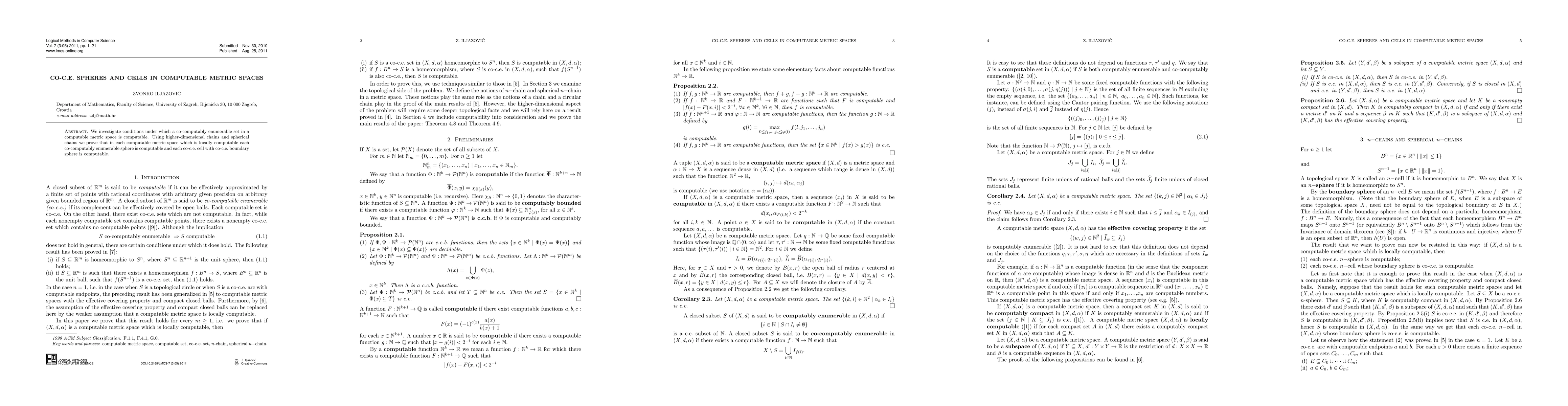 Researchers investigated computable metric spaces where co-computably enumerable spheres are computable, using higher-dimensional chains and spherical chains to prove results for locally computable spaces.