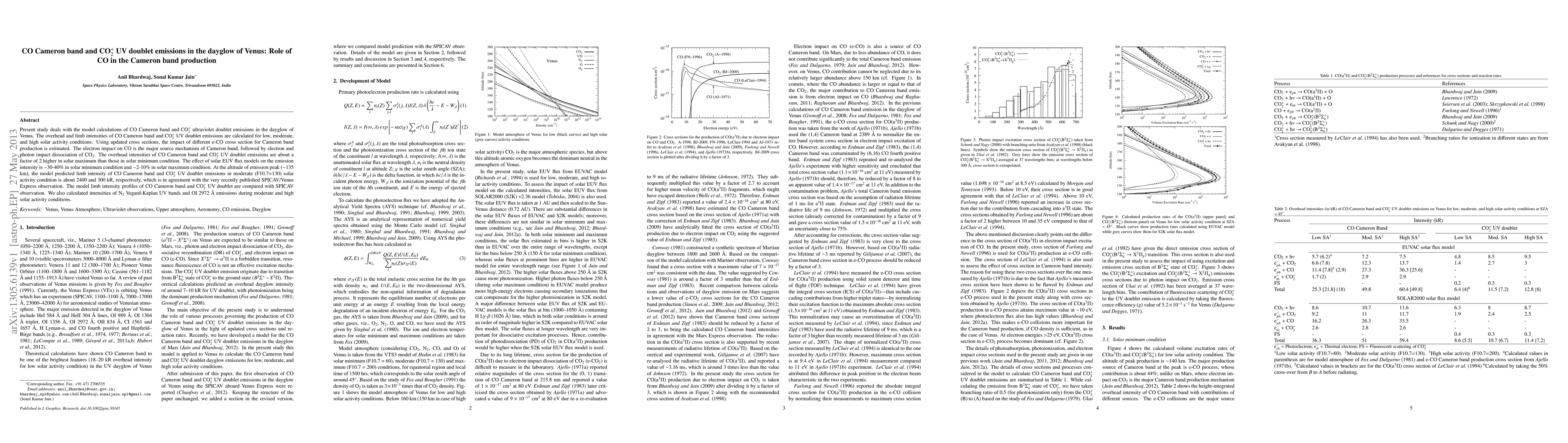 This study models CO Cameron band and CO2+ UV doublet emissions in Venus' dayglow, finding electron impact on CO as the primary source for Cameron band production. Overhead intensities are about twice as high in solar maximum compared to solar minimum, with solar EUV flux models affecting emissions by ~30-40% in solar minimum and ~2-10% in solar maximum.