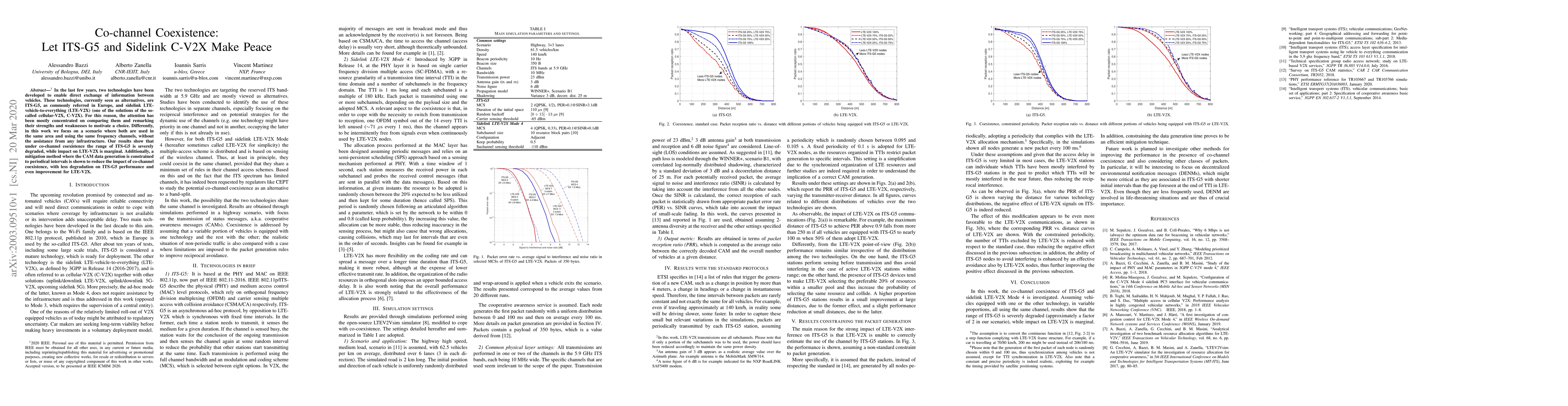 This paper investigates the co-channel coexistence of ITS-G5 and sidelink LTE-V2X technologies, finding that ITS-G5 performance degrades significantly while LTE-V2X remains largely unaffected. A proposed mitigation method, which limits CAM data generation, reduces ITS-G5 degradation and even enhances LTE-V2X performance.