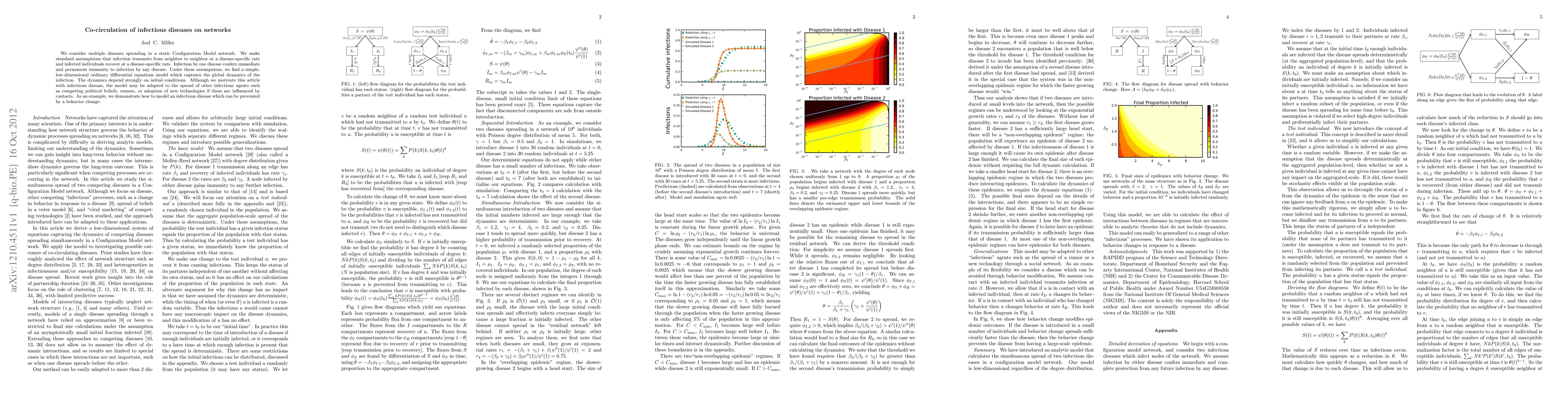 This paper develops a mathematical model to study the co-circulation of multiple infectious diseases on a static network, finding that global infection dynamics are strongly influenced by initial conditions. The model, adaptable beyond diseases to phenomena like competing beliefs or technology adoption, also illustrates how behavior changes can prevent disease spread.