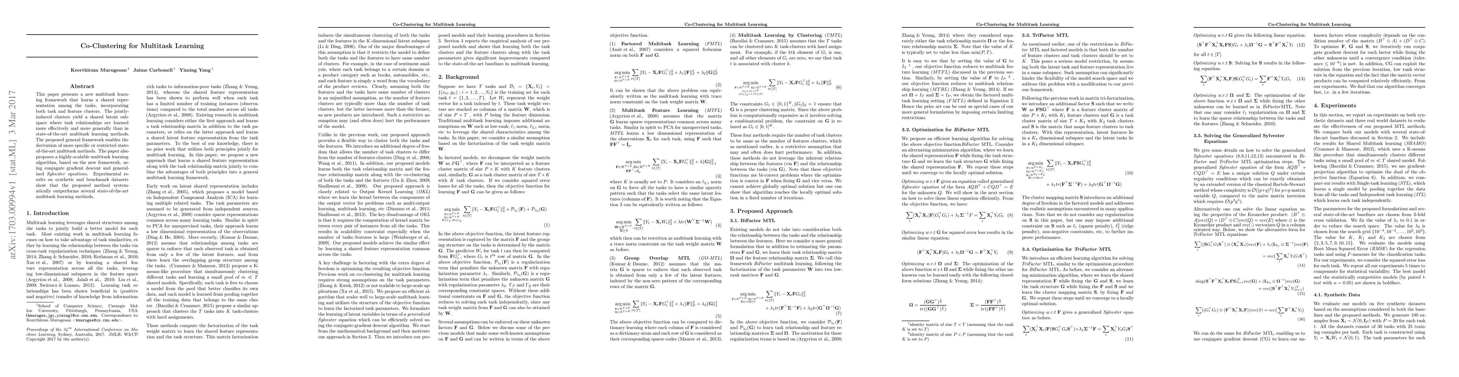 This paper introduces a novel multitask learning framework that leverages co-clustering to learn shared representations among tasks, achieving better task relationship learning through a shared latent subspace. The proposed scalable algorithm, based on conjugate gradient descent and generalized Sylvester equations, outperforms existing methods in experiments.