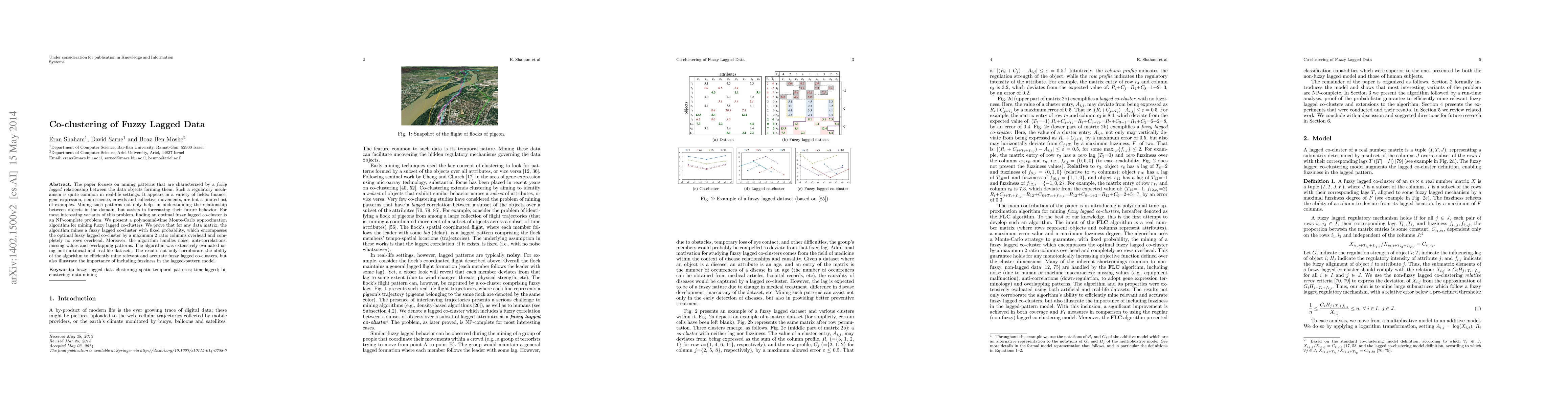 Researchers developed a polynomial-time algorithm to mine fuzzy lagged co-clusters in large datasets, efficiently handling noise and overlapping patterns while providing accurate results. The algorithm demonstrates the importance of including fuzziness in lagged-pattern models for better understanding and forecasting.