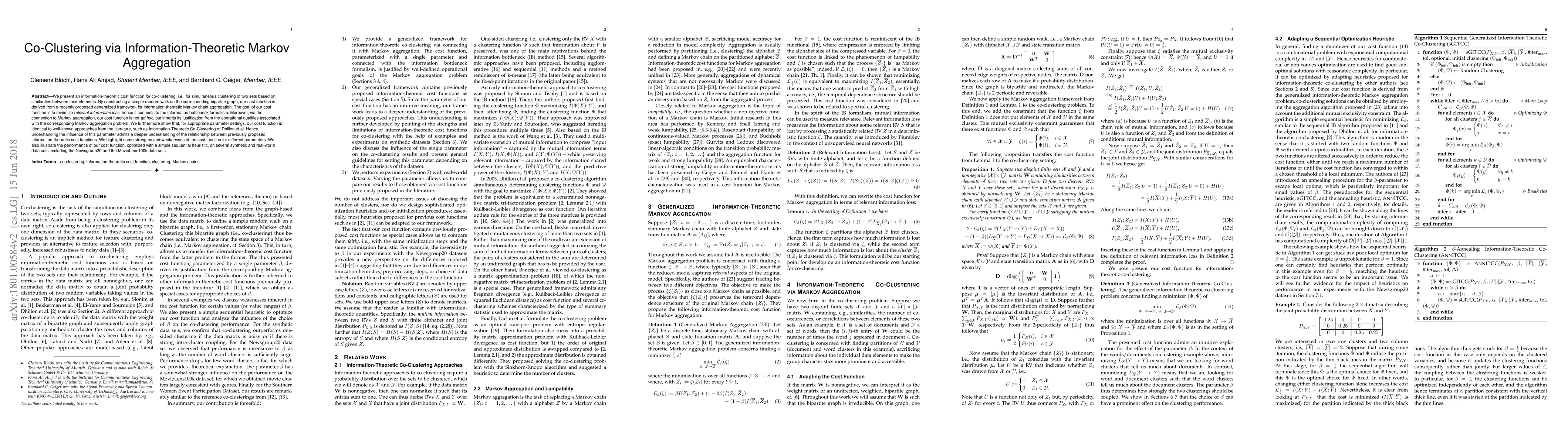 This paper introduces an information-theoretic cost function for co-clustering based on a generalized Markov aggregation framework, aiming to minimize information loss. It demonstrates the function's equivalence to existing methods under certain parameters and evaluates its performance on various datasets.