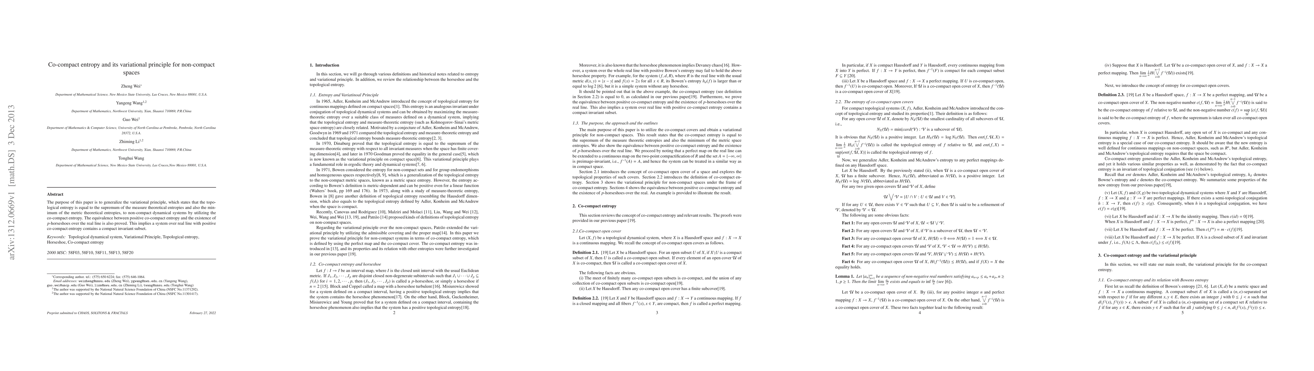 The purpose of this paper is to generalize the variational principle, which states that the topological entropy is equal to the supremum of the measure theoretical entropies and also the minimum of the metric theoretical entropies, to non-compact dynamical systems by utilizing the co-compact entropy. The equivalence between positive co-compact entropy and the existence of p-horseshoes over the real line is also proved. This implies a system over real line with positive co-compact entropy contains a compact invariant subset.