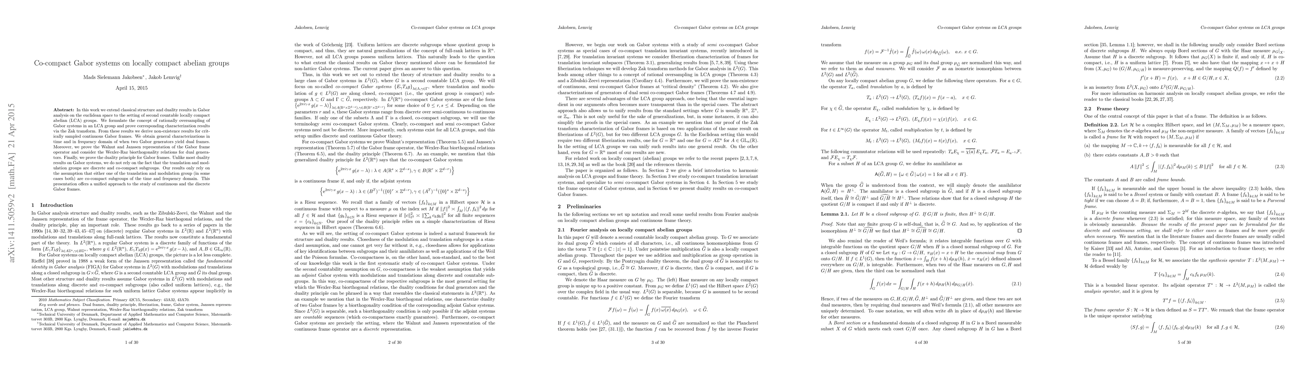 This paper extends classical Gabor analysis results to second countable locally compact abelian groups, proving new characterizations and duality principles for Gabor systems without requiring co-compactness of both translation and modulation groups. The study includes the Walnut and Janssen representation and the Wexler-Raz biorthogonality relations for dual generators.