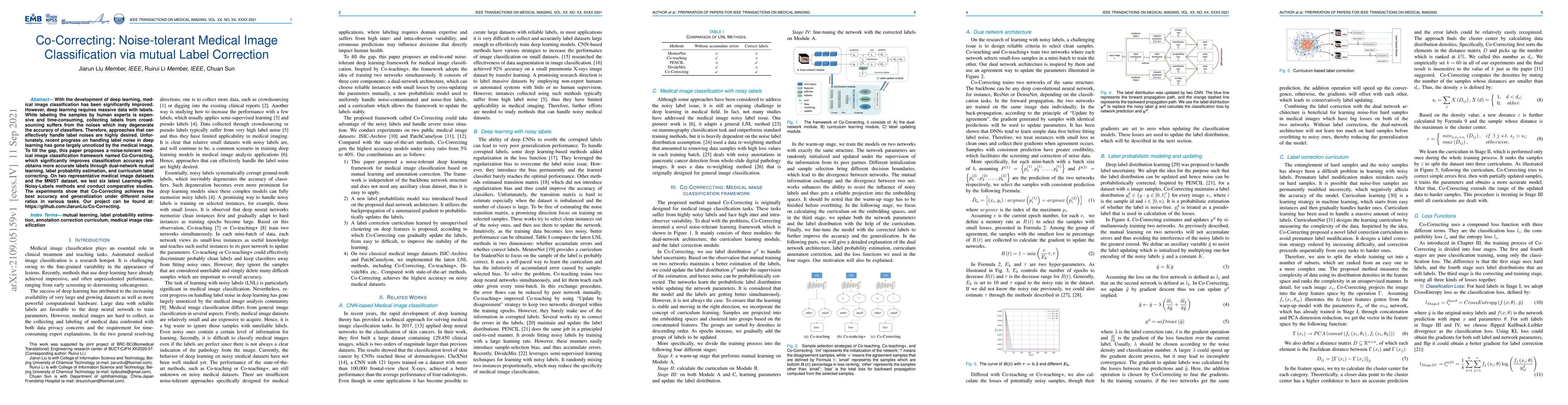 This paper introduces Co-Correcting, a framework for noise-tolerant medical image classification using mutual label correction. It employs dual-network mutual learning, label probability estimation, and curriculum label correcting to improve accuracy and handle label noise, outperforming six other state-of-the-art methods on medical and benchmark datasets.