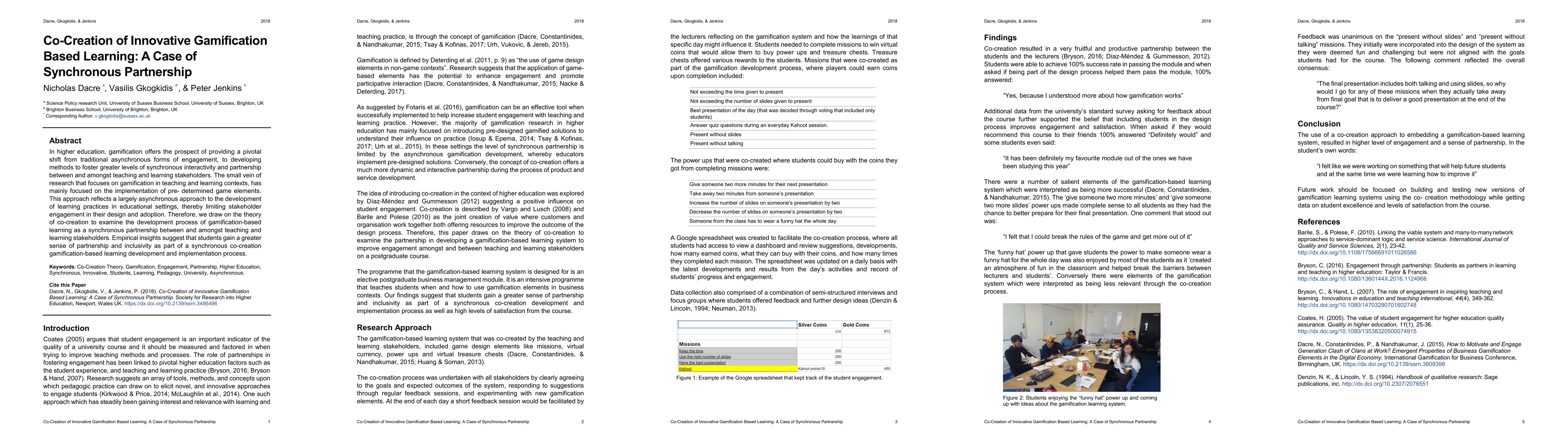 In higher education, gamification offers the prospect of providing a pivotal shift from traditional asynchronous forms of engagement, to developing methods to foster greater levels of synchronous interactivity and partnership between and amongst teaching and learning stakeholders. The small vein of research that focuses on gamification in teaching and learning contexts, has mainly focused on the implementation of pre-determined game elements. This approach reflects a largely asynchronous approach to the development of learning practices in educational settings, thereby limiting stakeholder engagement in their design and adoption. Therefore, we draw on the theory of co-creation to examine the development process of gamification-based learning as a synchronous partnership between and amongst teaching and learning stakeholders. Empirical insights suggest that students gain a greater sense of partnership and inclusivity as part of a synchronous co-creation gamification-based learning development and implementation process.