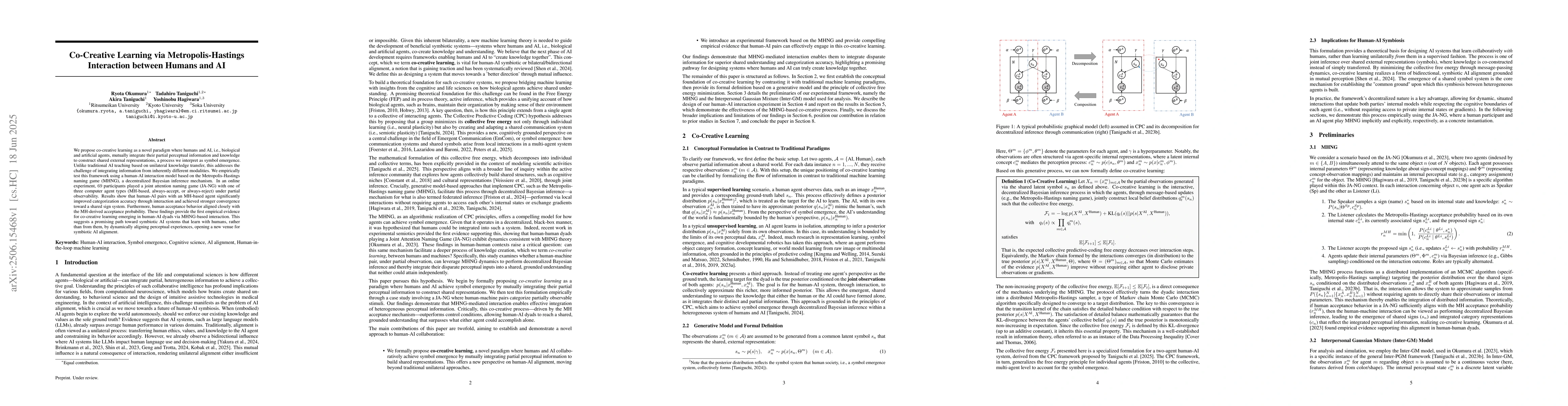 We propose co-creative learning as a novel paradigm where humans and AI, i.e., biological and artificial agents, mutually integrate their partial perceptual information and knowledge to construct shared external representations, a process we interpret as symbol emergence. Unlike traditional AI teaching based on unilateral knowledge transfer, this addresses the challenge of integrating information from inherently different modalities. We empirically test this framework using a human-AI interaction model based on the Metropolis-Hastings naming game (MHNG), a decentralized Bayesian inference mechanism. In an online experiment, 69 participants played a joint attention naming game (JA-NG) with one of three computer agent types (MH-based, always-accept, or always-reject) under partial observability. Results show that human-AI pairs with an MH-based agent significantly improved categorization accuracy through interaction and achieved stronger convergence toward a shared sign system. Furthermore, human acceptance behavior aligned closely with the MH-derived acceptance probability. These findings provide the first empirical evidence for co-creative learning emerging in human-AI dyads via MHNG-based interaction. This suggests a promising path toward symbiotic AI systems that learn with humans, rather than from them, by dynamically aligning perceptual experiences, opening a new venue for symbiotic AI alignment.