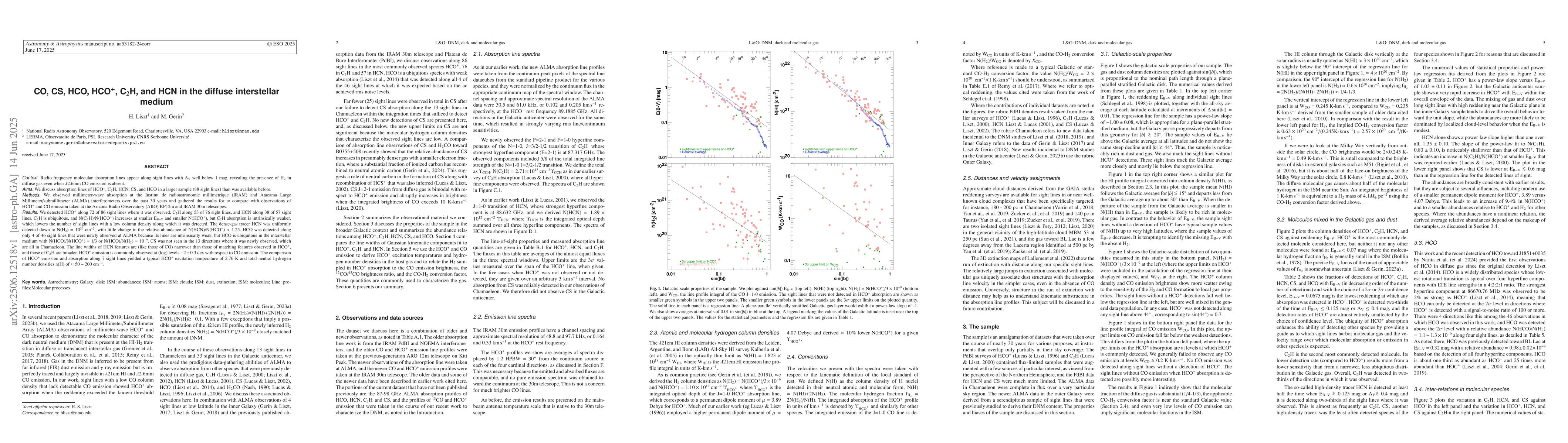 Context. Radio frequency molecular absorption lines appear along sight lines with AV well below 1 mag, revealing the presence of H2 in diffuse gas even when 2.6mm CO emission is absent. Aims. We discuss absorption lines of HCO+, C2H, HCN, CS, and HCO in a larger sample (88 sight lines) than was available before. Methods. We observed millimeter-wave absorption at the IRAM and ALMA interferometers over the past 30 years and gathered the results for to compare with observations of HCO+ and CO emission taken at the ARO KP12m and IRAM 30m telescopes. Results: We detected HCO+ along 72 of 86 sightlines where it was observed, C2H along 53 of 76 sightlines and HCN along 38 of 57 sightlines. C2H is ubiquitous and N(C2H)/N(HCO+) increases at smaller EB-V and smaller N(HCO+) but C2H absorption is intrinsically weaker, decreasing the number of sightlines with low column density along which it was detected.The dense-gas tracer HCN was uniformly detected down to N(H2) = 10^20 cm-2 with little change in the relative abundance N(HCN)/N(HCO+) = 1.25. HCO was detected along only 4 of 46 sight lines that were newly observed at ALMA because its lines are intrinsically weak, but HCO is ubiquitous in the interstellar medium with N(HCO)/N(HCO+) = 1/3 or N(HCO)/N(H2) = 10^-9. The line widths of HCN features are (like those of CO) narrower than those of matching features observed in HCO+, and those of C2H are broader. HCO+ emission is commonly observed at log levels -2+/-0.3 dex with respect to CO emission.