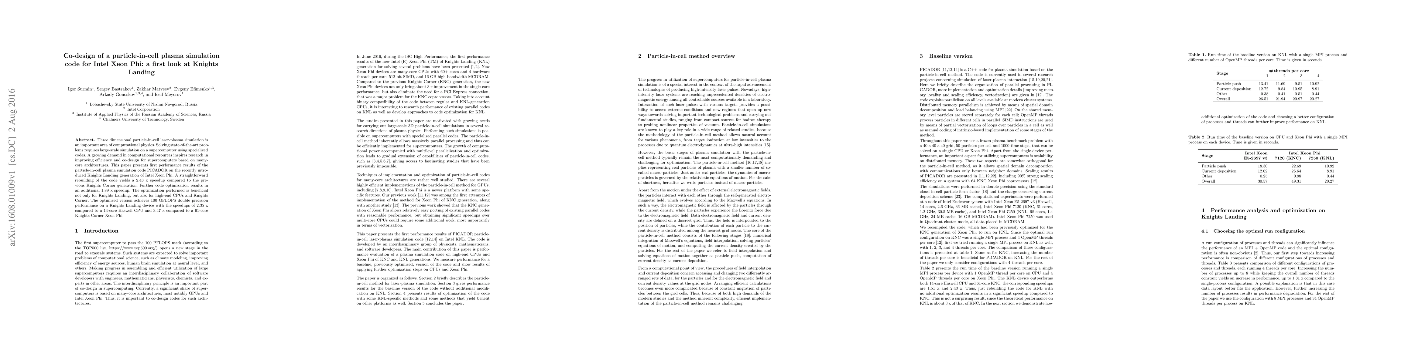 This paper investigates the performance optimization of the PICADOR particle-in-cell plasma simulation code on Intel's Xeon Phi Knights Landing architecture, achieving a 2.43 x speedup over Knights Corner and further optimizations yielding an additional 1.89 x speedup, demonstrating significant efficiency gains for high-performance simulations.