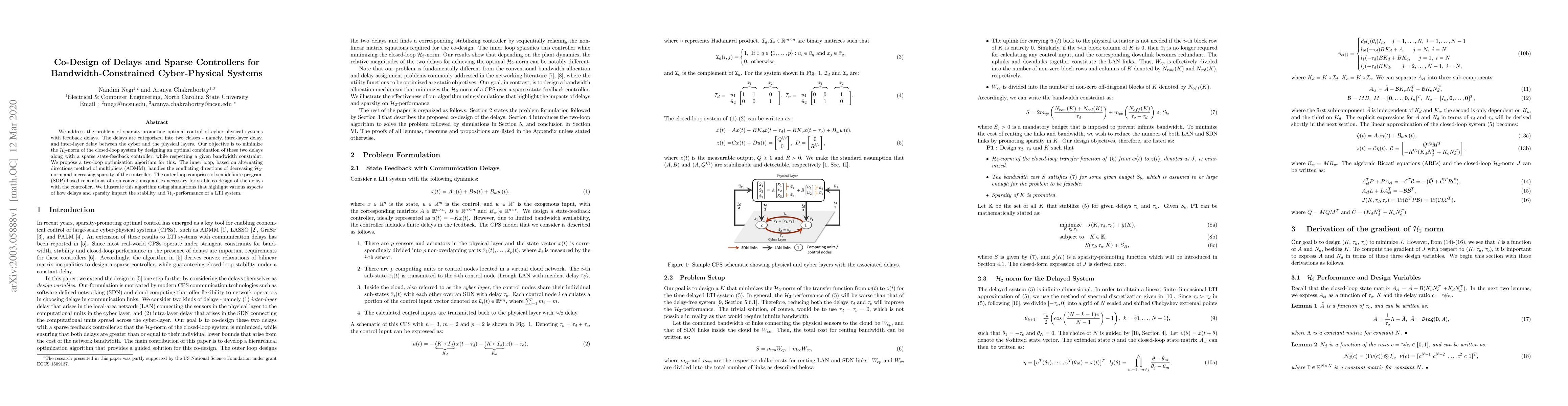 This paper proposes an optimization algorithm to design sparse controllers for bandwidth-constrained cyber-physical systems with feedback delays, aiming to minimize the H2-norm. It uses a two-loop approach combining ADMM and SDP to handle delay and sparsity trade-offs, validated through simulations.