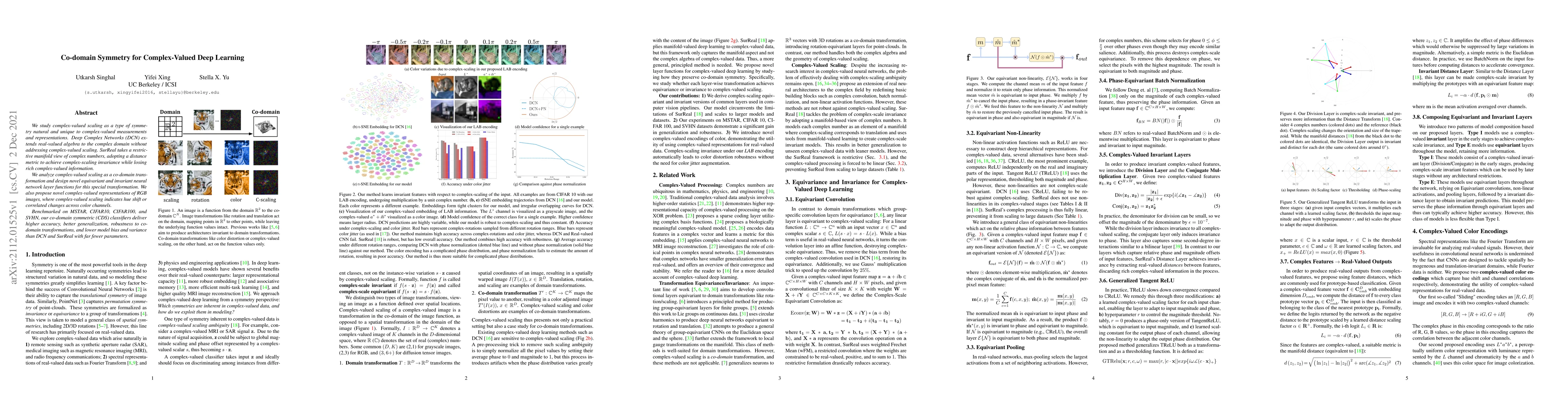 We study complex-valued scaling as a type of symmetry natural and unique to complex-valued measurements and representations. Deep Complex Networks (DCN) extends real-valued algebra to the complex domain without addressing complex-valued scaling. SurReal takes a restrictive manifold view of complex numbers, adopting a distance metric to achieve complex-scaling invariance while losing rich complex-valued information. We analyze complex-valued scaling as a co-domain transformation and design novel equivariant and invariant neural network layer functions for this special transformation. We also propose novel complex-valued representations of RGB images, where complex-valued scaling indicates hue shift or correlated changes across color channels. Benchmarked on MSTAR, CIFAR10, CIFAR100, and SVHN, our co-domain symmetric (CDS) classifiers deliver higher accuracy, better generalization, robustness to co-domain transformations, and lower model bias and variance than DCN and SurReal with far fewer parameters.