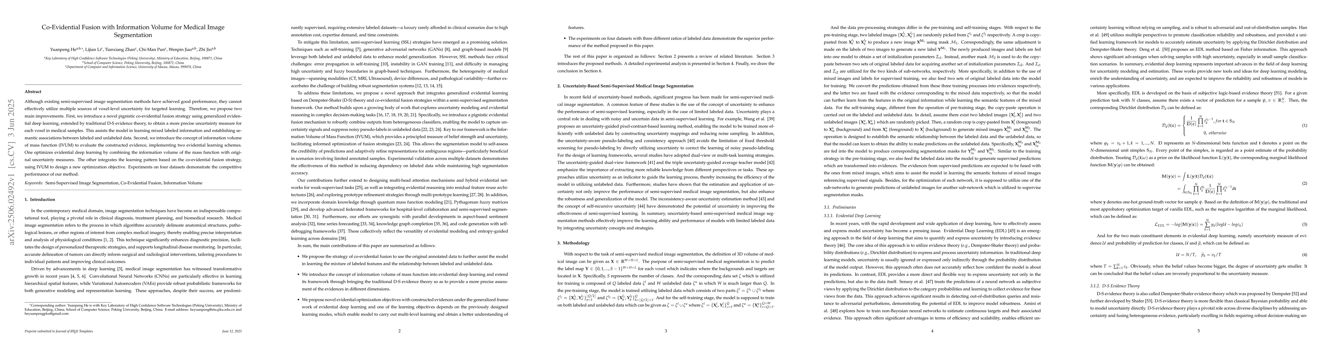 Although existing semi-supervised image segmentation methods have achieved good performance, they cannot effectively utilize multiple sources of voxel-level uncertainty for targeted learning. Therefore, we propose two main improvements. First, we introduce a novel pignistic co-evidential fusion strategy using generalized evidential deep learning, extended by traditional D-S evidence theory, to obtain a more precise uncertainty measure for each voxel in medical samples. This assists the model in learning mixed labeled information and establishing semantic associations between labeled and unlabeled data. Second, we introduce the concept of information volume of mass function (IVUM) to evaluate the constructed evidence, implementing two evidential learning schemes. One optimizes evidential deep learning by combining the information volume of the mass function with original uncertainty measures. The other integrates the learning pattern based on the co-evidential fusion strategy, using IVUM to design a new optimization objective. Experiments on four datasets demonstrate the competitive performance of our method.