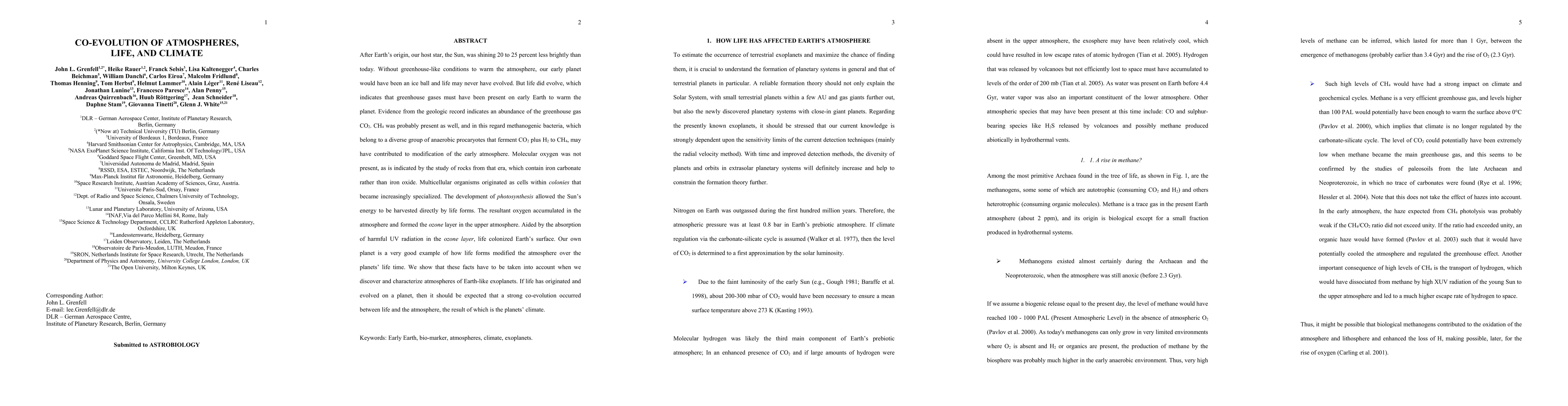After Earth's origin, our host star, the Sun, was shining 20 to 25 percent less brightly than today. Without greenhouse-like conditions to warm the atmosphere, our early planet would have been an ice ball and life may never have evolved. But life did evolve, which indicates that greenhouse gases must have been present on early Earth to warm the planet. Evidence from the geologic record indicates an abundance of the greenhouse gas CO2. CH4 was probably present as well, and in this regard methanogenic bacteria, which belong to a diverse group of anaerobic procaryotes that ferment CO 2 plus H2 to CH4, may have contributed to modification of the early atmosphere. Molecular oxygen was not present, as is indicated by the study of rocks from that era, which contain iron carbonate rather than iron oxide. Multicellular organisms originated as cells within colonies that became increasingly specialized. The development of photosynthesis allowed the Sun's energy to be harvested directly by life forms. The resultant oxygen accumulated in the atmosphere and formed the ozone layer in the upper atmosphere. Aided by the absorption of harmful UV radiation in the ozone layer, life colonized Earth's surface. Our own planet is a very good example of how life forms modified the atmosphere over the planets' life time. We show that these facts have to be taken into account when we discover and characterize atmospheres of Earth-like exoplanets. If life has originated and evolved on a planet, then it should be expected that a strong co-evolution occurred between life and the atmosphere, the result of which is the planets' climate.